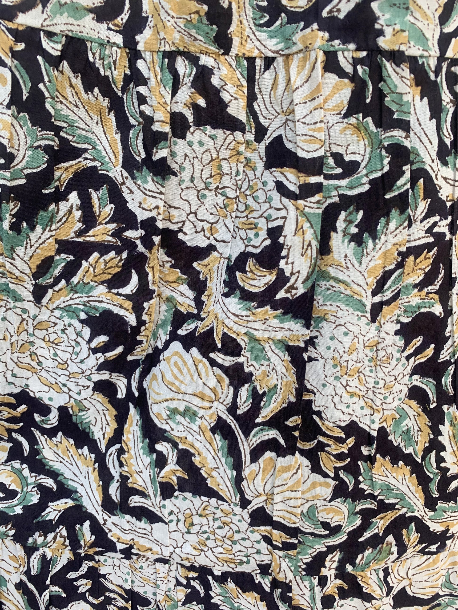 Black Beige Floral Block Print Cotton Smocked Dress – Handcrafted Boho Midi Sundress – Free Shipping