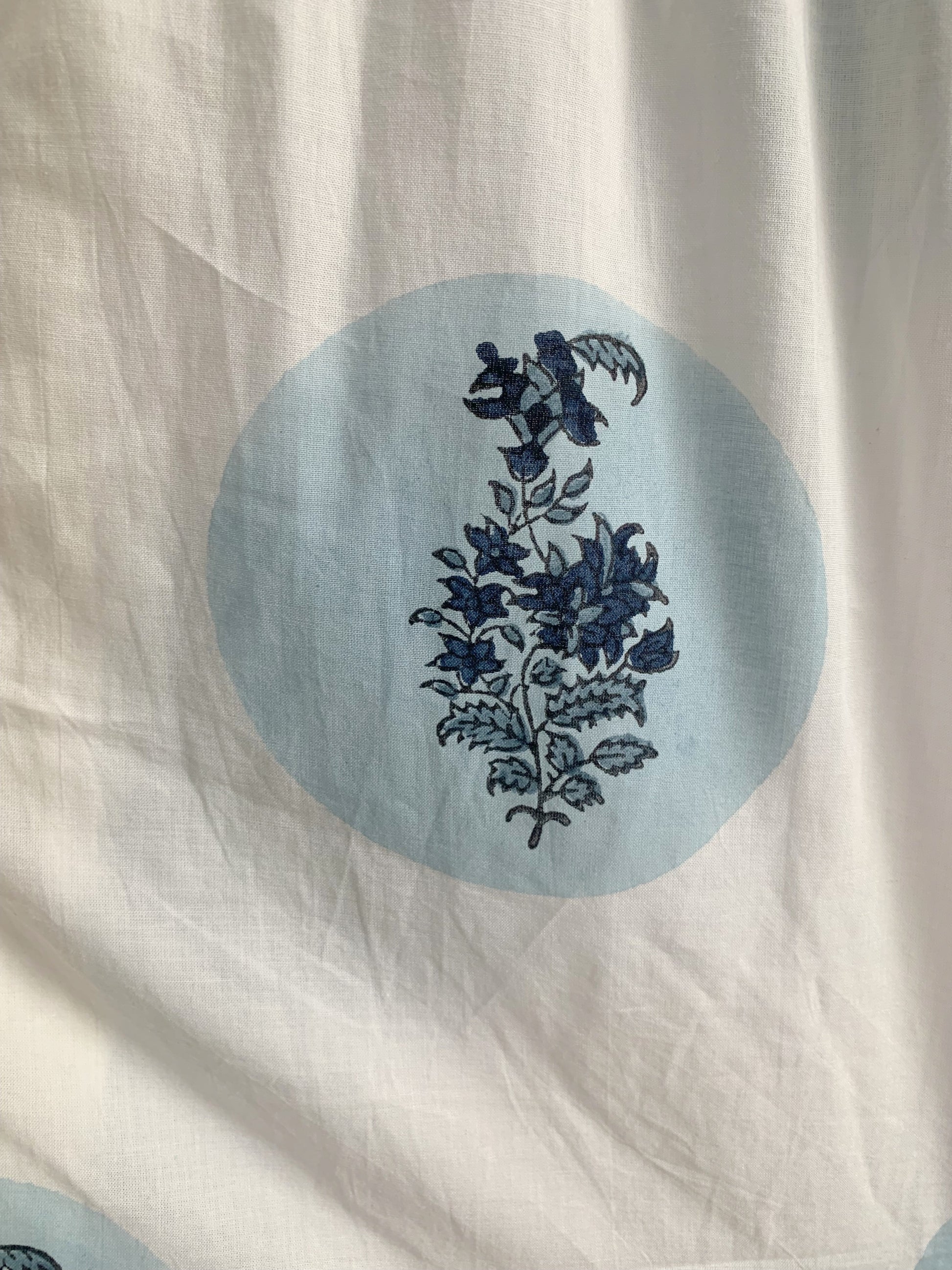 Pattern: Hand block printed blue circle motifs on an ivory base