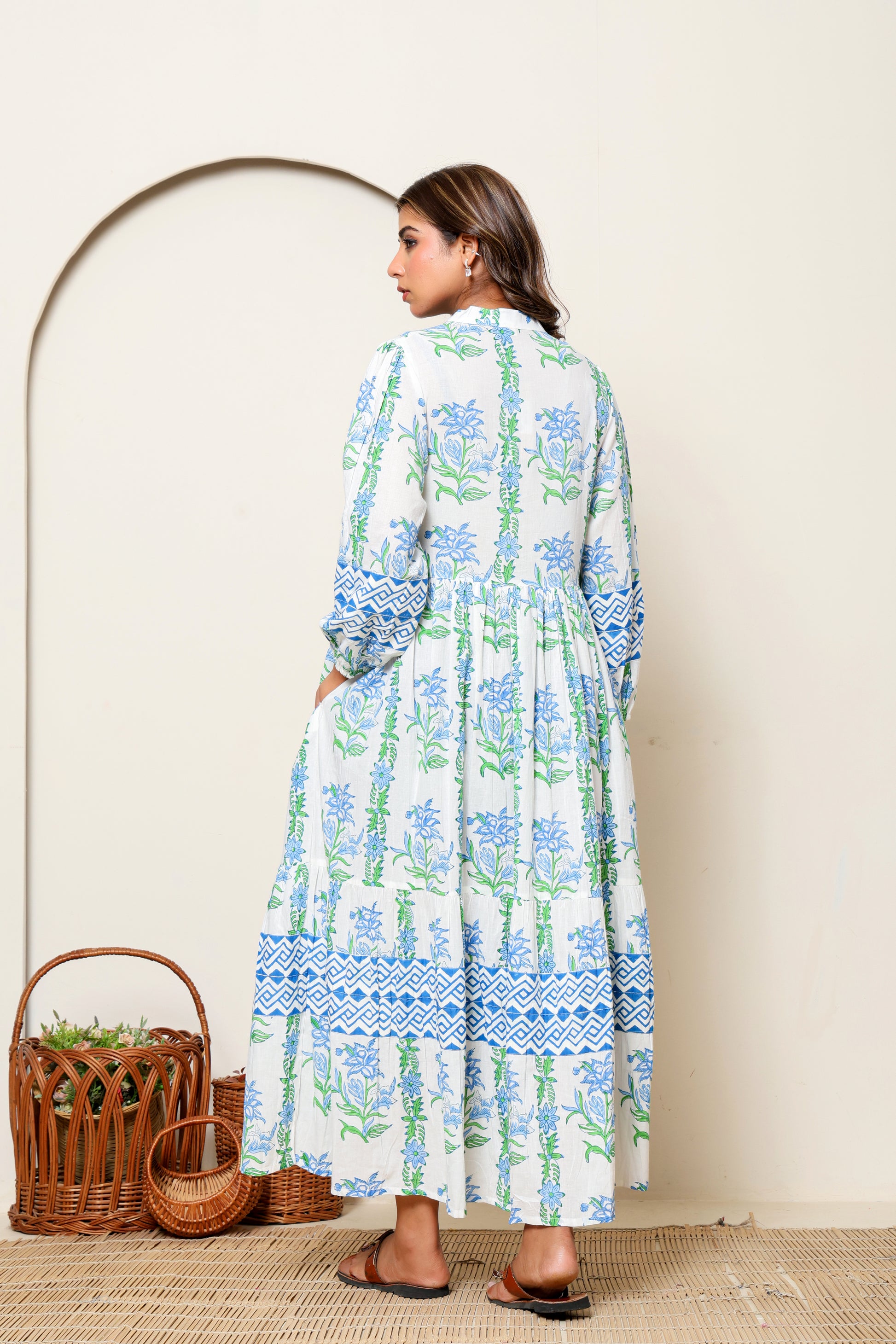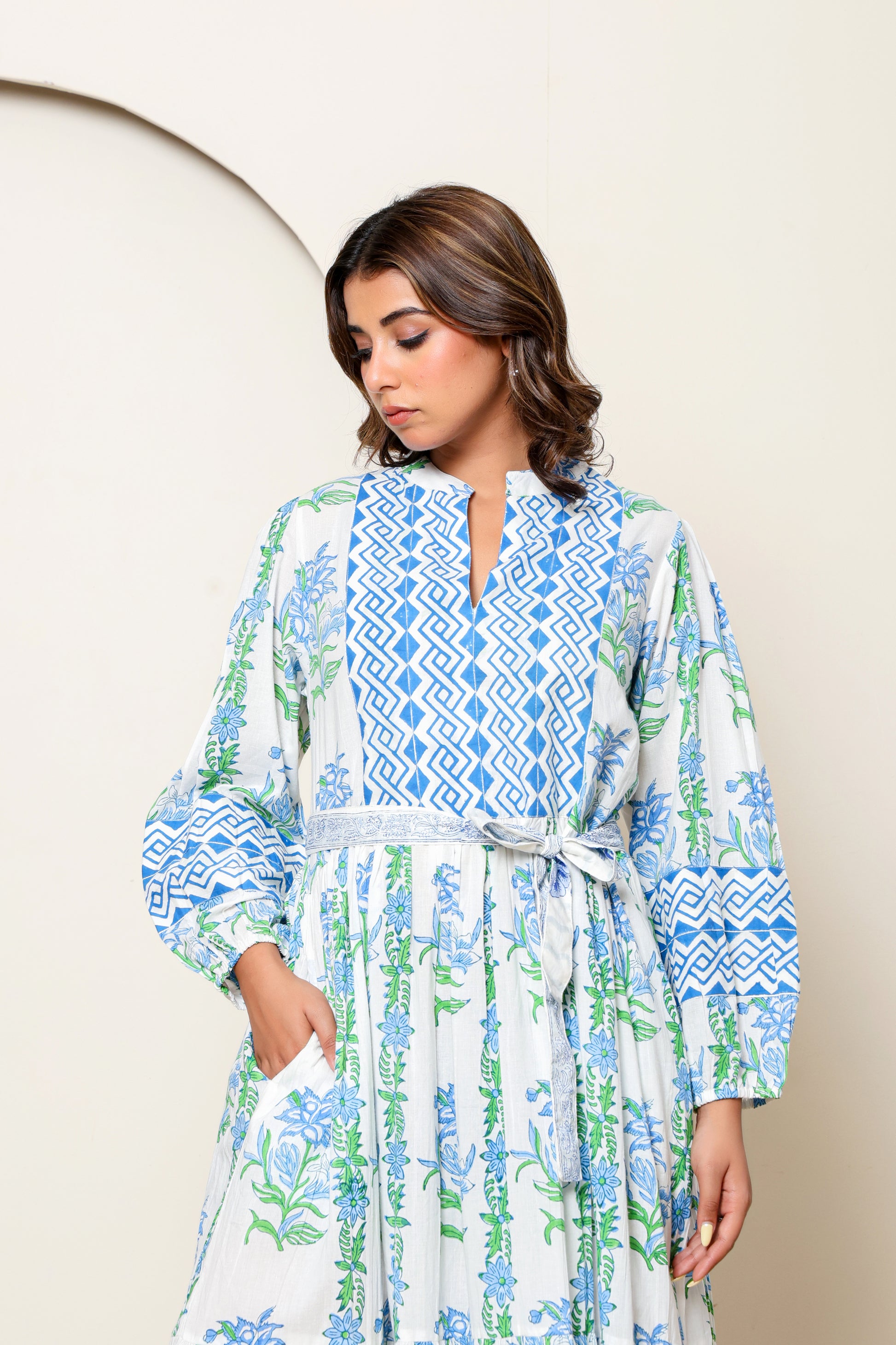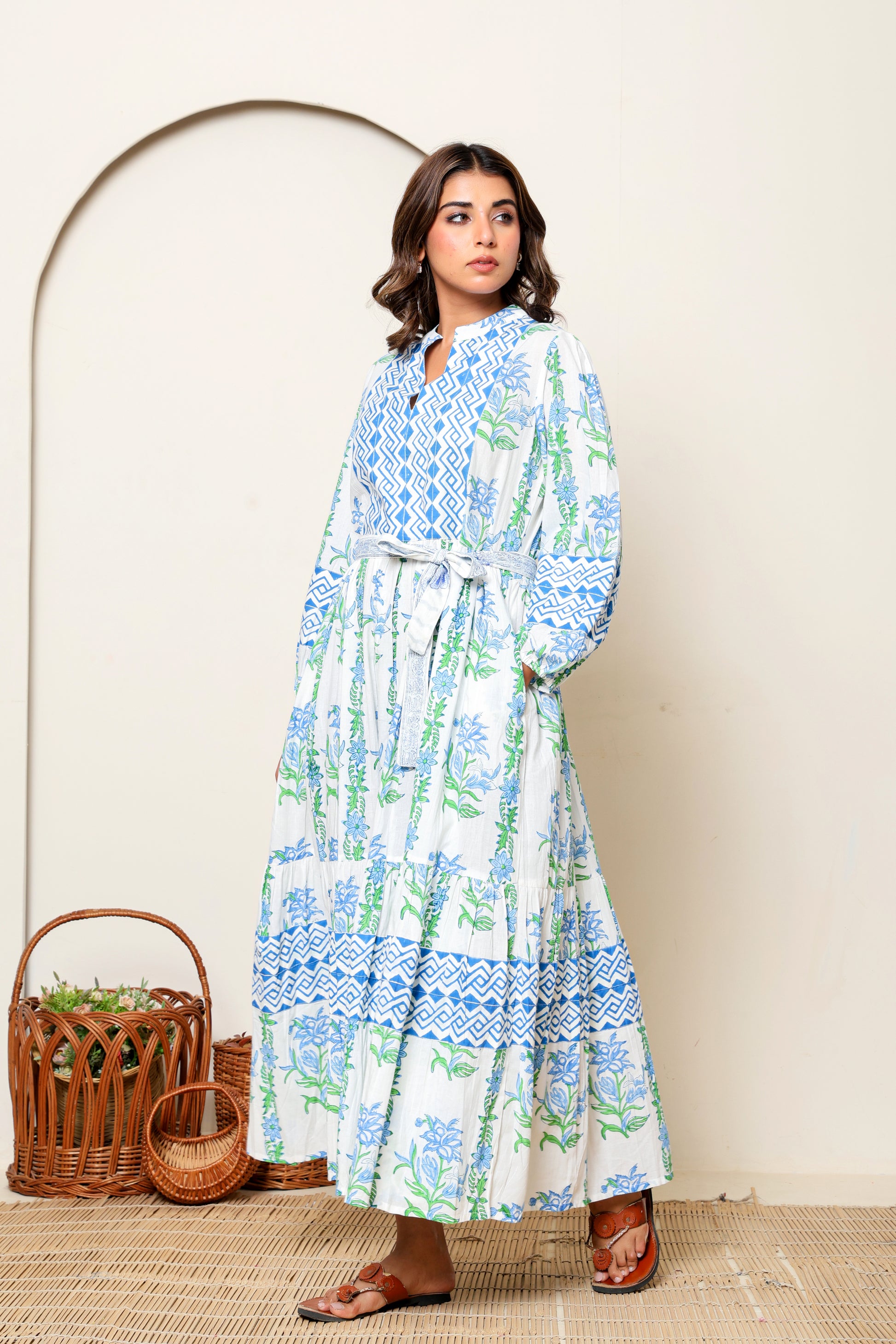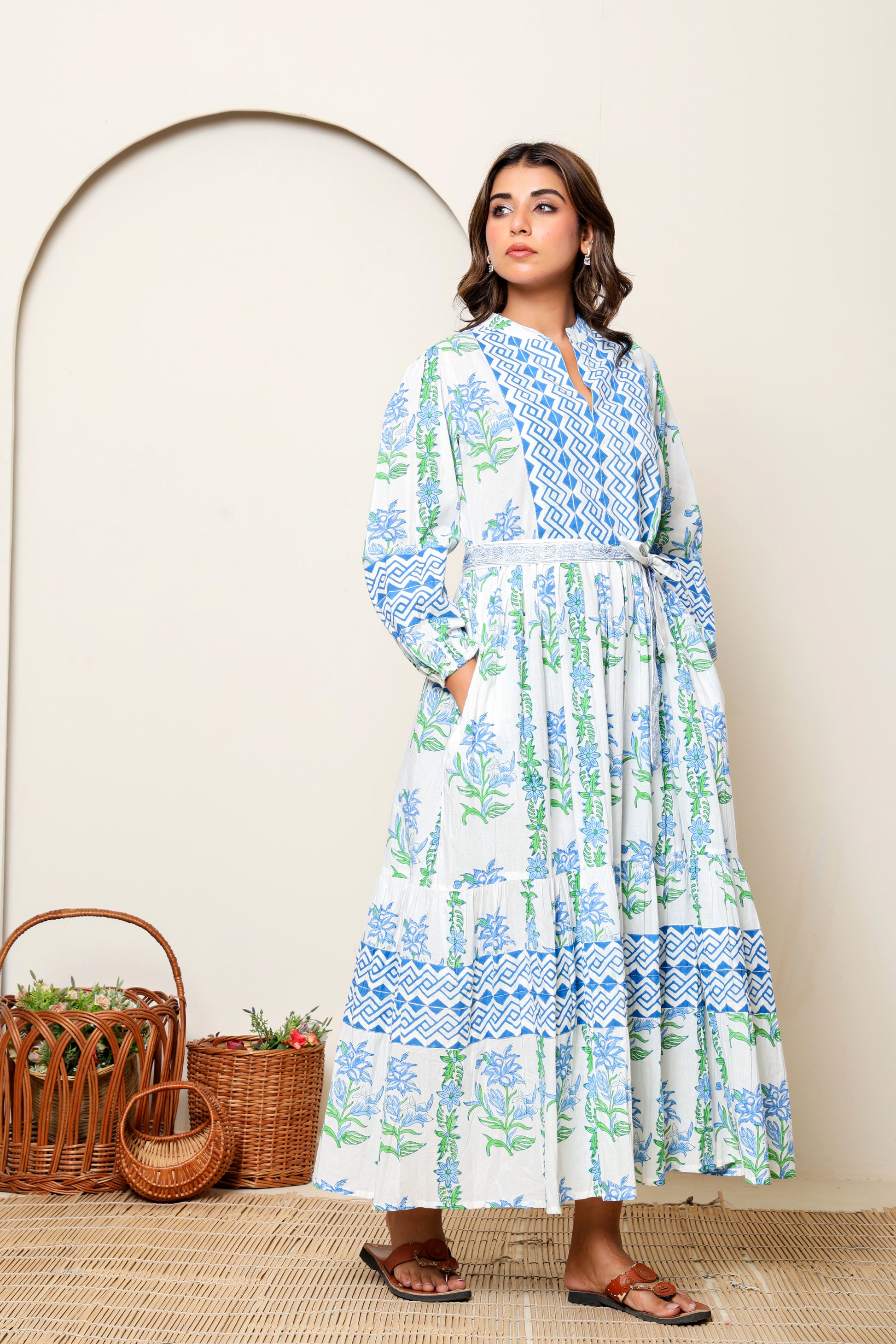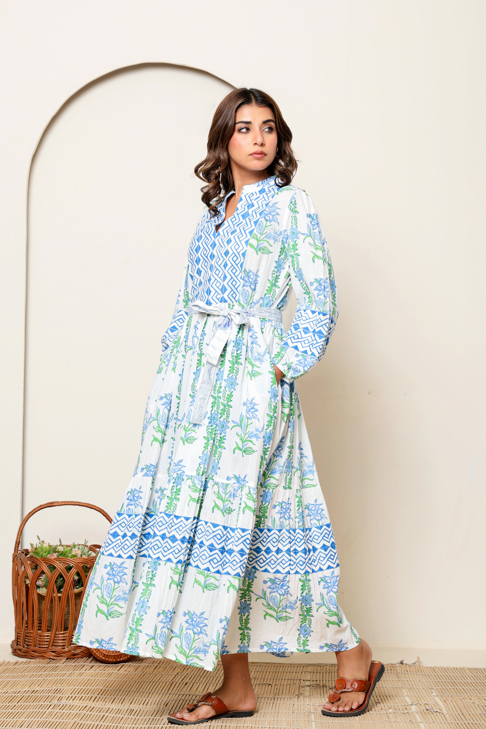 Blue & Green Floral Hand Block Printed Cotton Maxi Dress – Long Sleeve Bohemian Summer Dress with Belt & Pockets