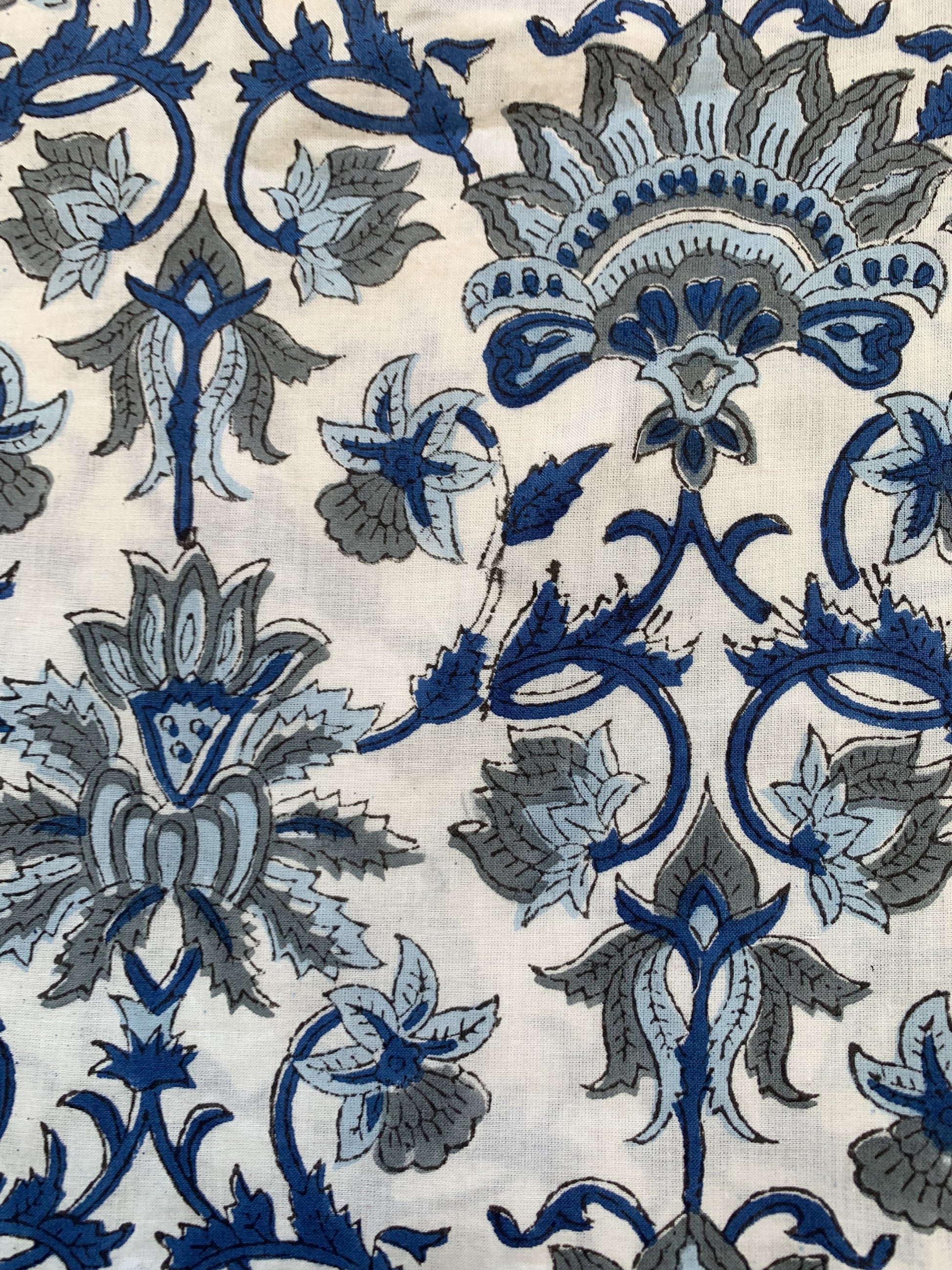 Pattern: Hand block printed floral motifs on a blue grey base