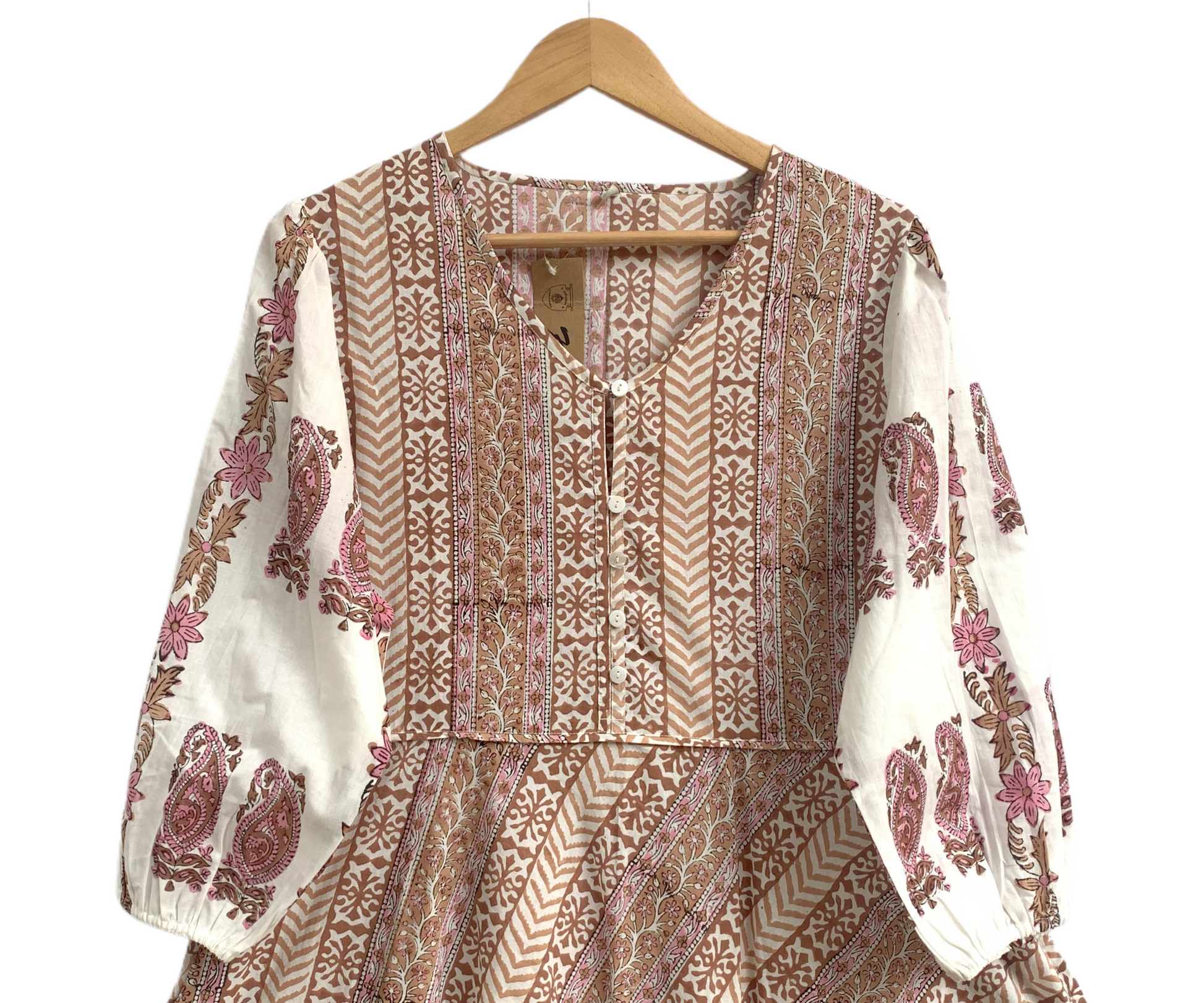 Handcrafted by skilled artisans in India using traditional hand block printing techniques, each piece reflects authentic craftsmanship with slight variations that make it uniquely yours. Designed with a tiered silhouette and soft puff sleeves, it offers breathable comfort and fluid movement.