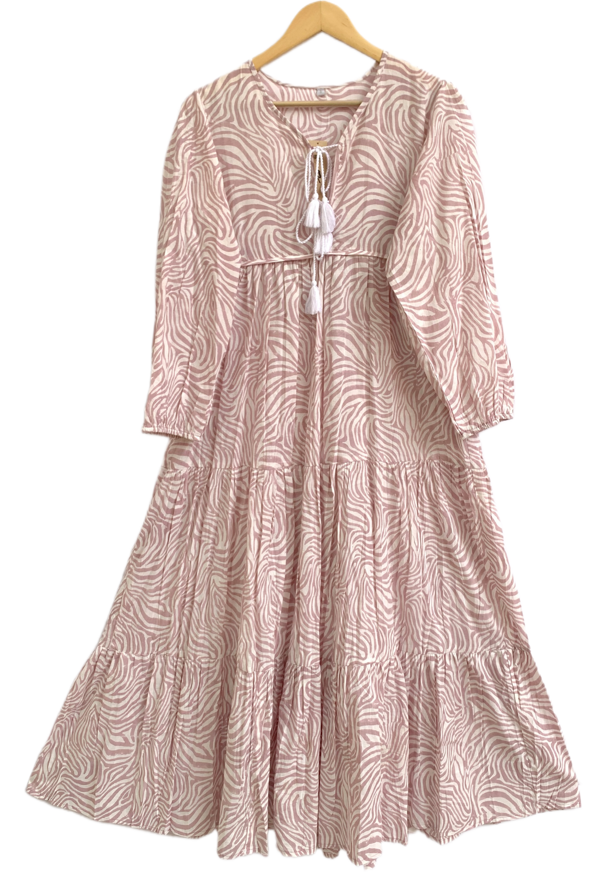 Blush Pink Zebra Print Cotton Maxi Dress – Tiered Boho Indian Style Tassel Tie Neck