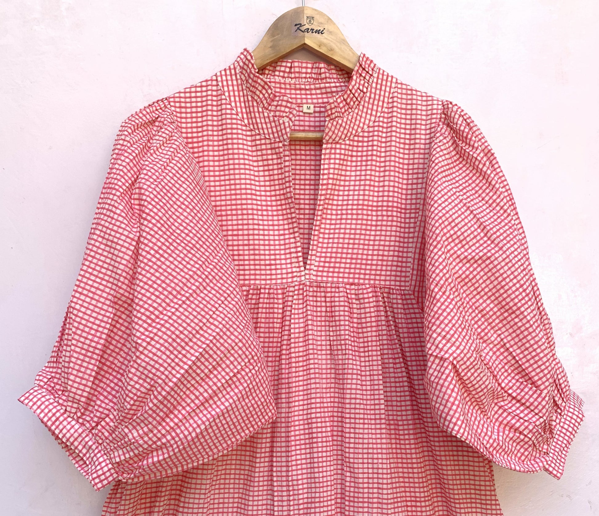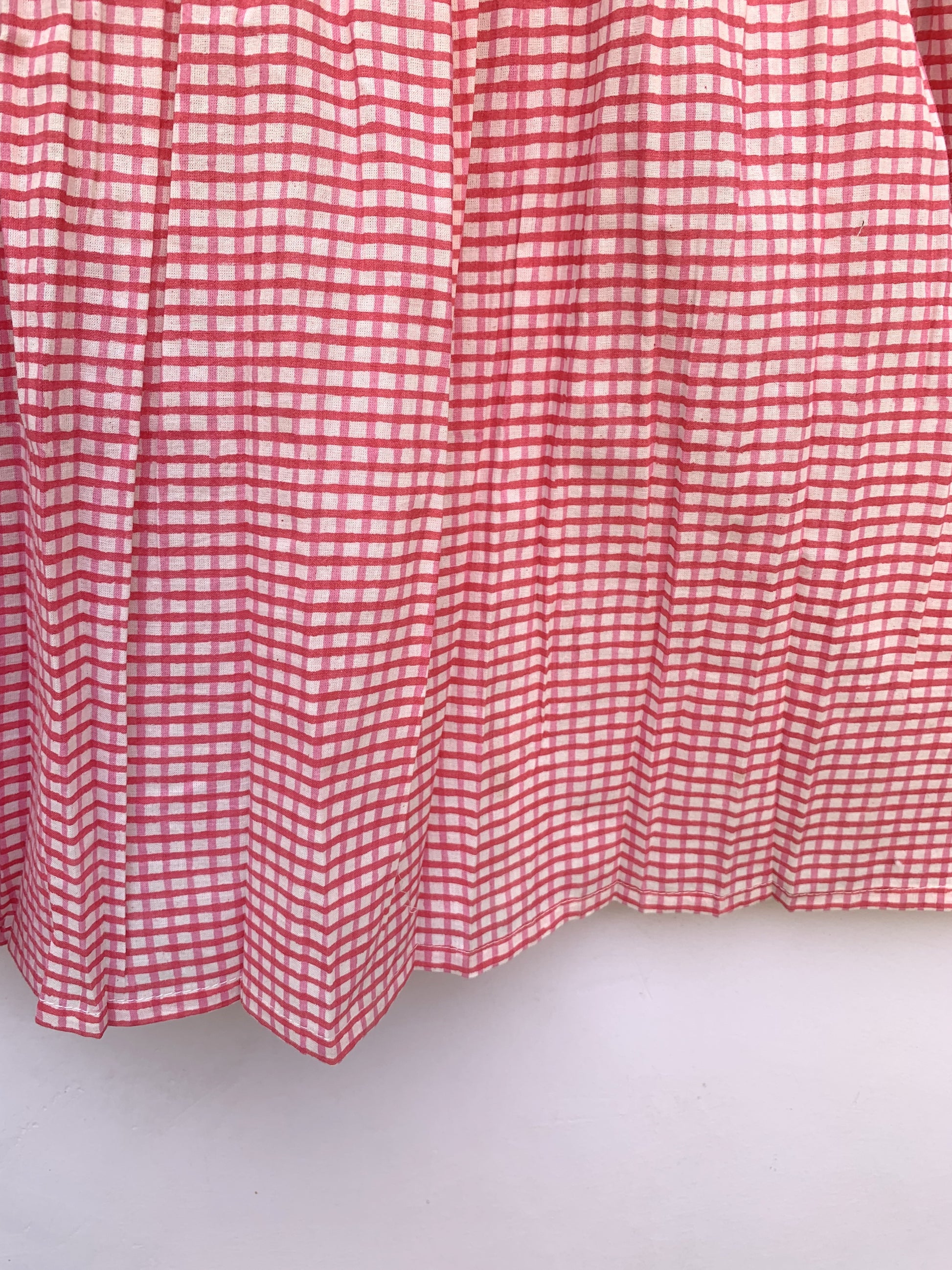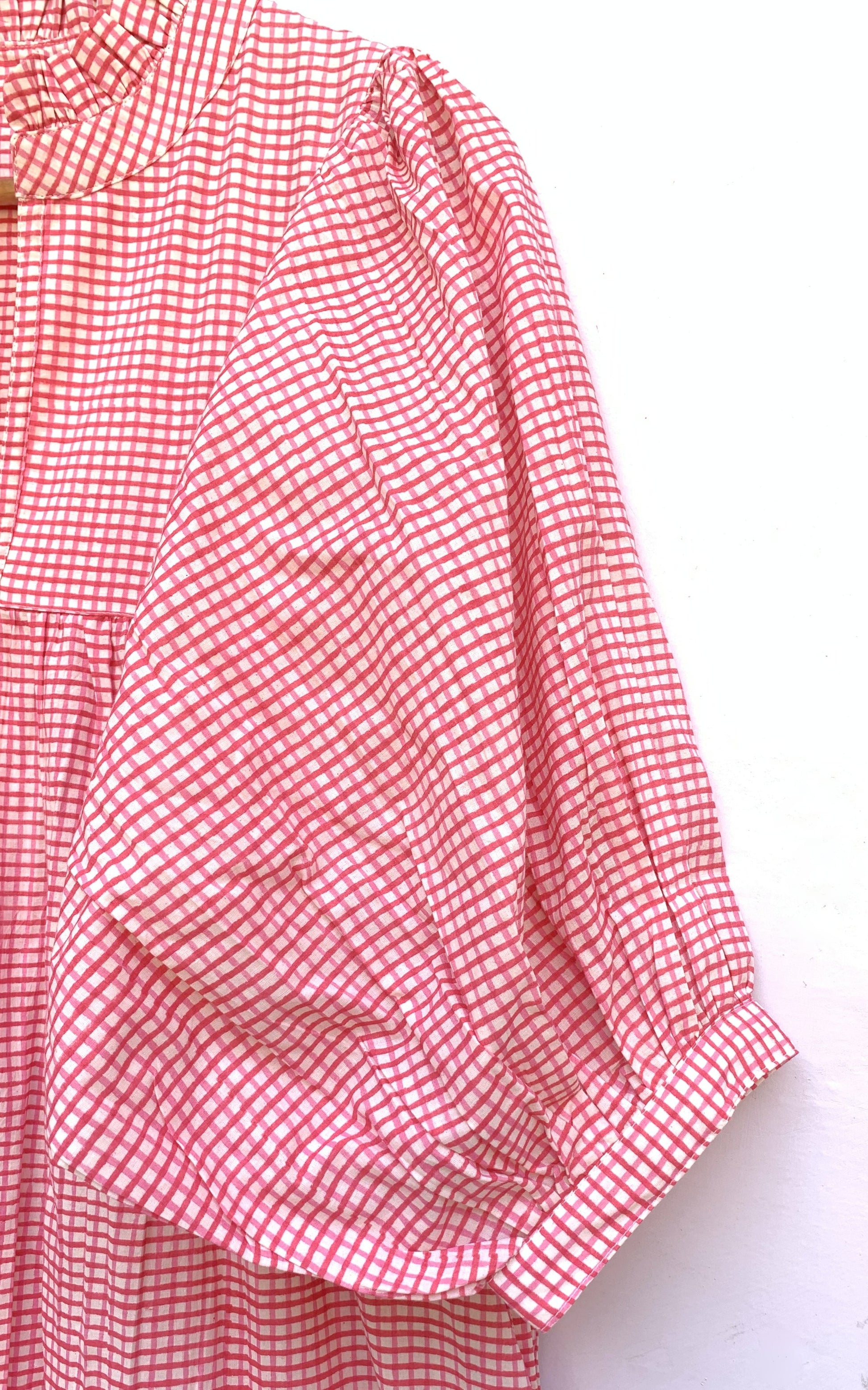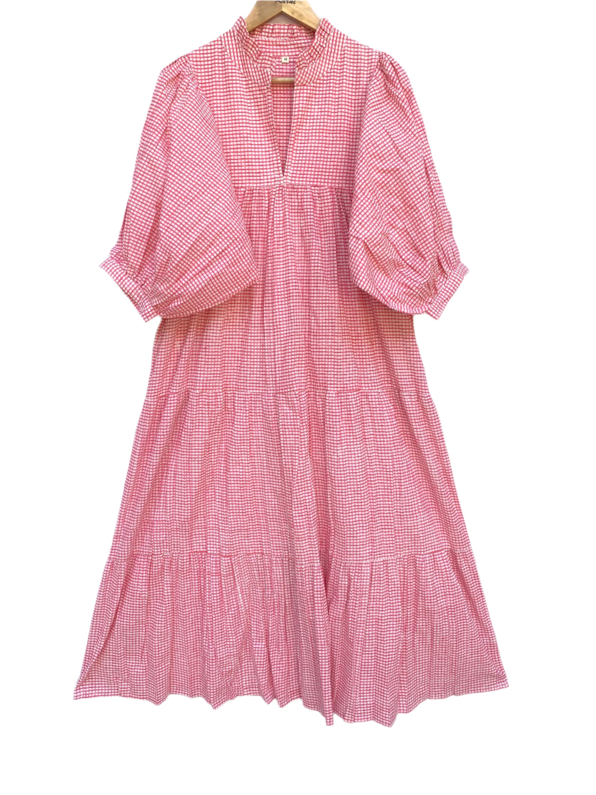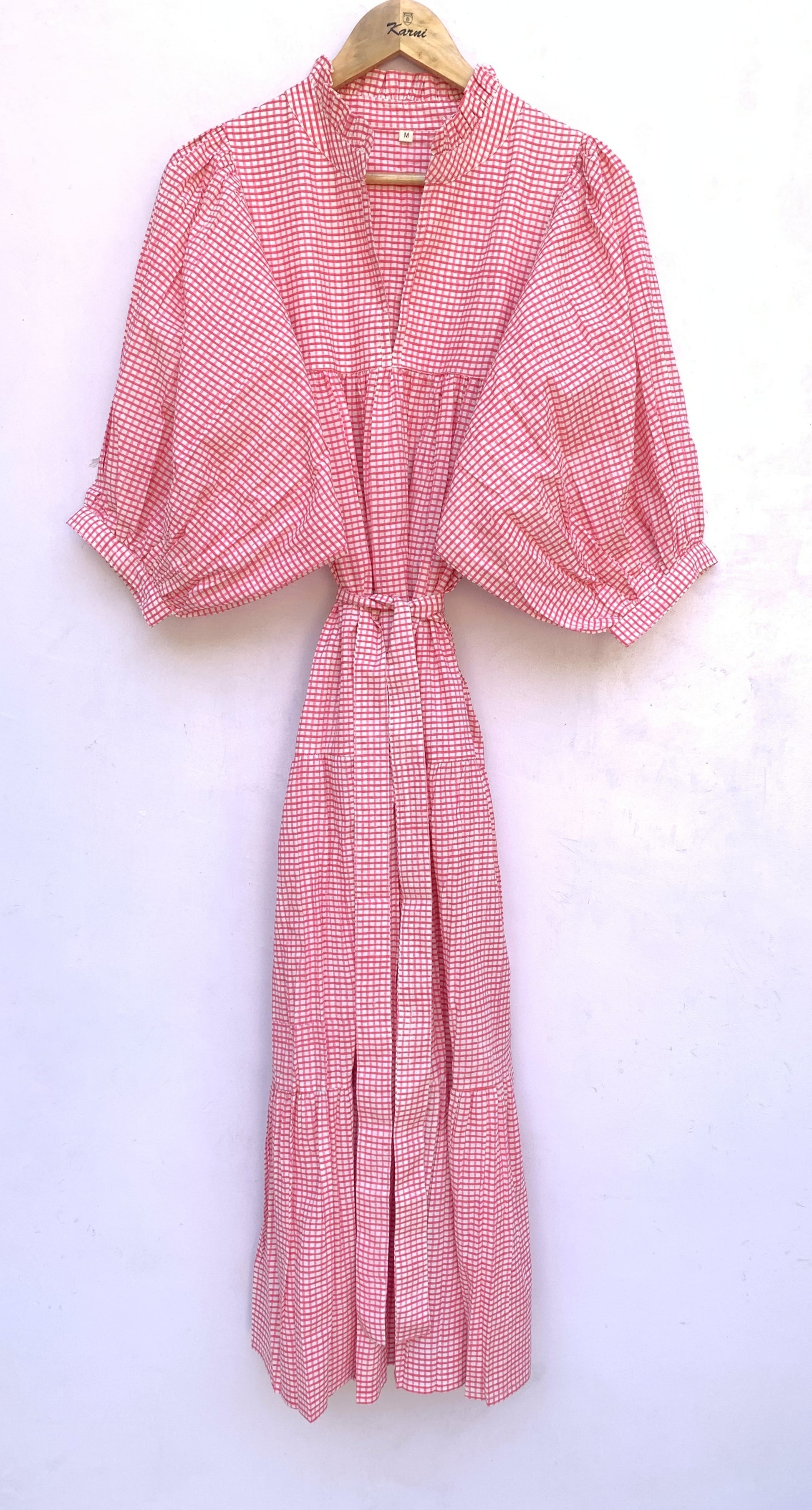 cotton pink checks printed women's long maxi dress - frill collar with belt maxi dress