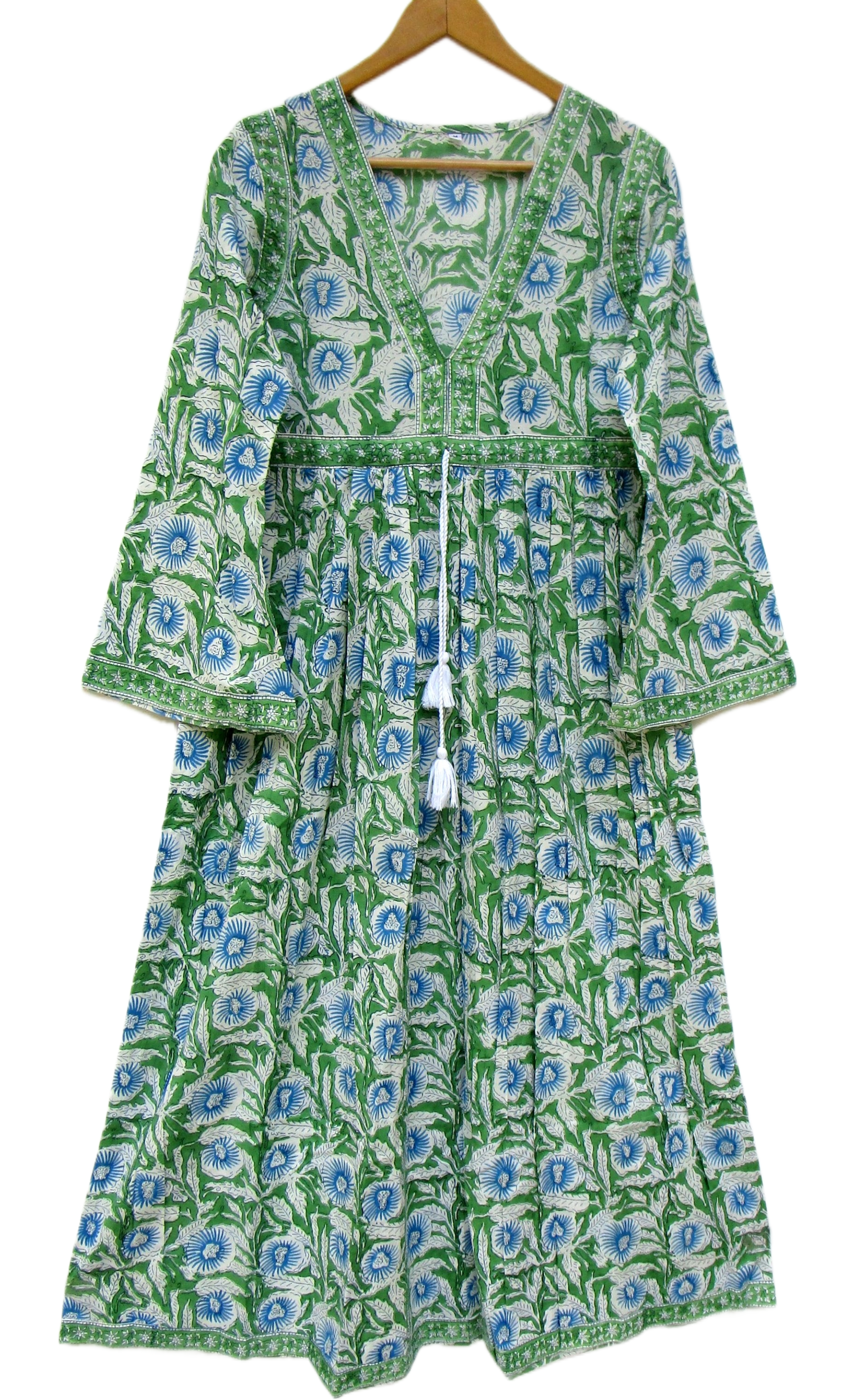 Green Floral Hand Block Printed Cotton Maxi Dress – Boho V-Neck Tassel Dress