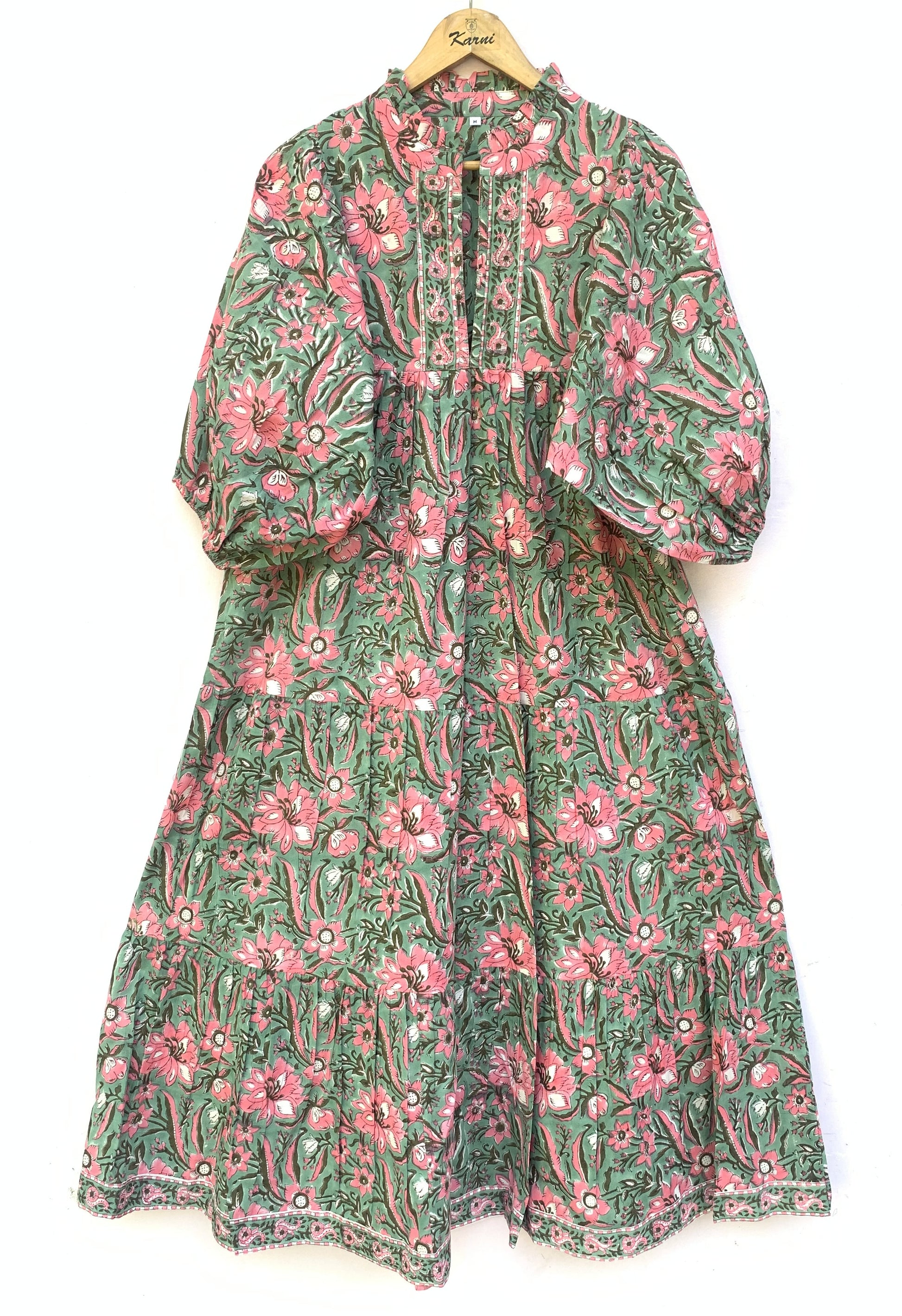 Green Pink Floral Block Print Cotton Midi Dress – Boho Handmade Tiered Dress with Puff Sleeves & Contrast Yoke