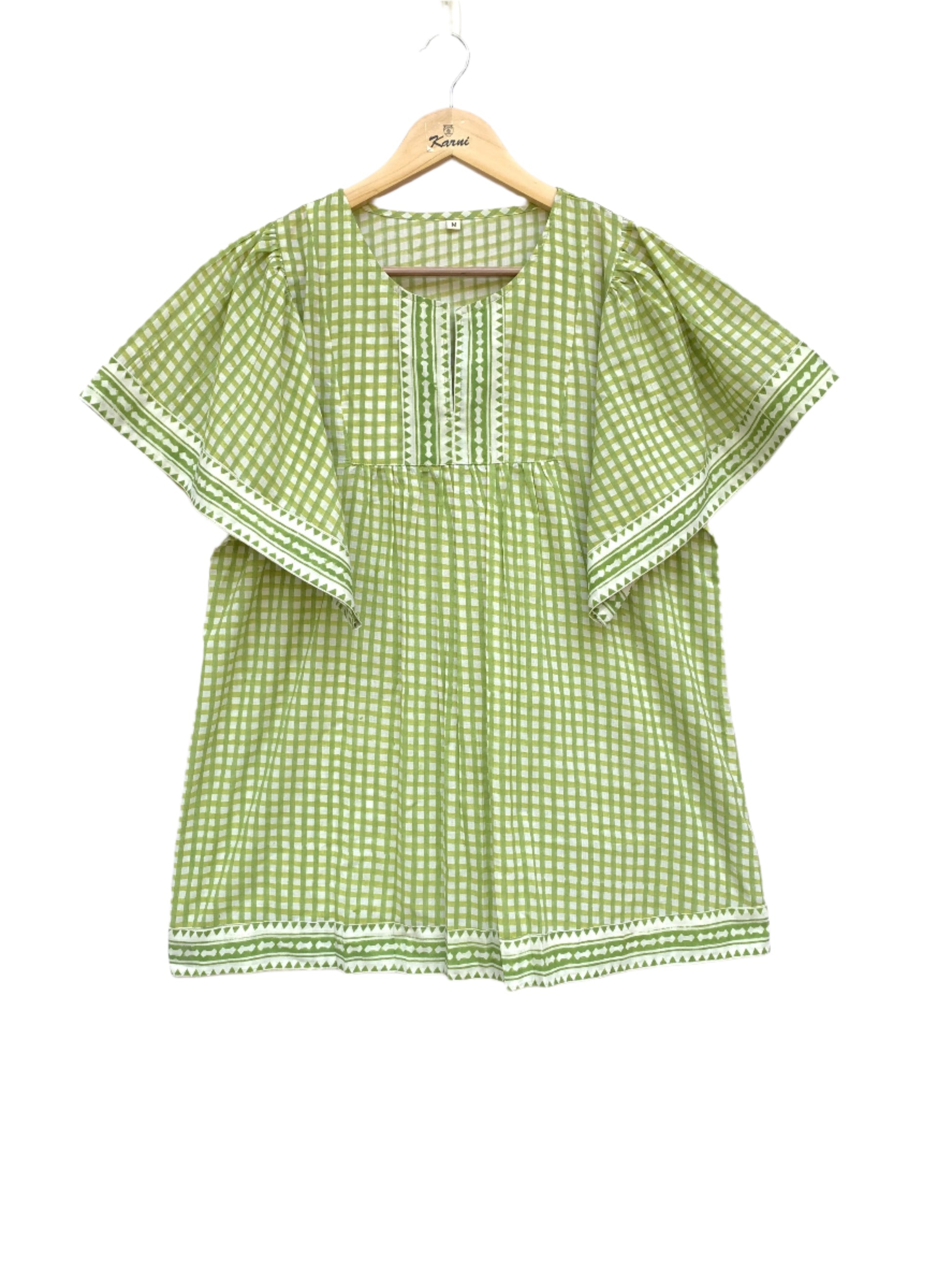 green plaid cotton blouse with v neck and short sleeves