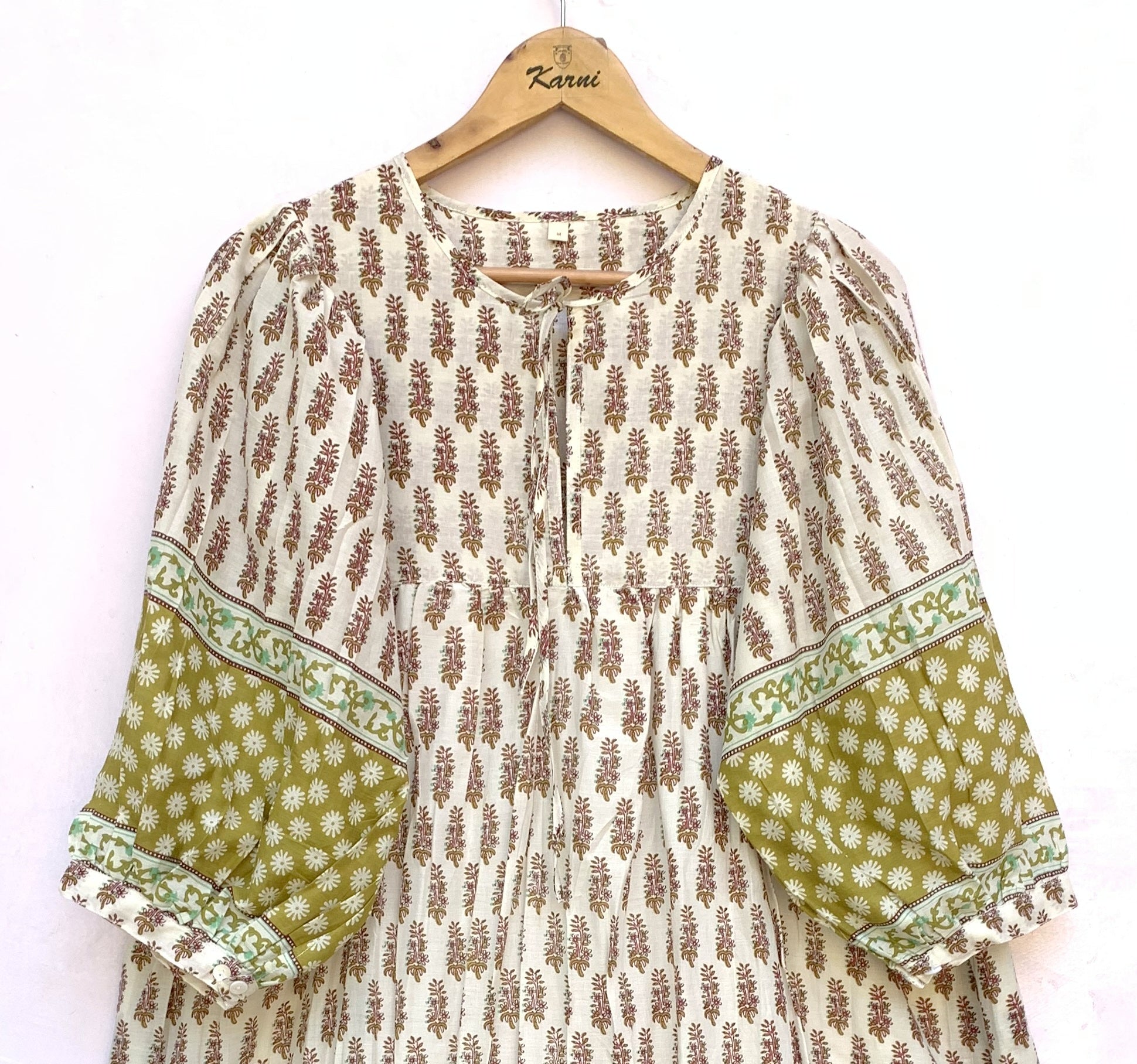 Ivory Olive Floral Hand Block Printed Cotton Midi Dress – Puff Sleeve Boho Indian Dress