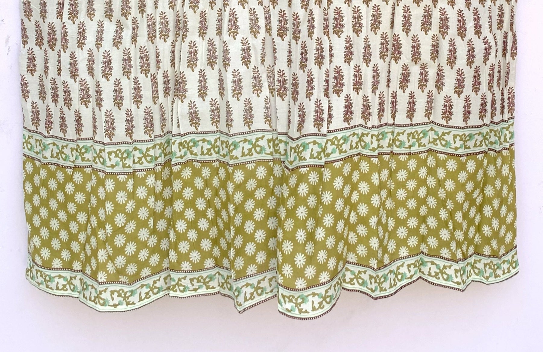 Soft, feminine, and beautifully crafted, this ivory olive floral screen printed cotton midi dress is an elegant addition to a boho-inspired wardrobe. Set on a soft ivory base with graceful olive green floral motifs, this dress blends contemporary screen printing with relaxed, everyday boho charm.