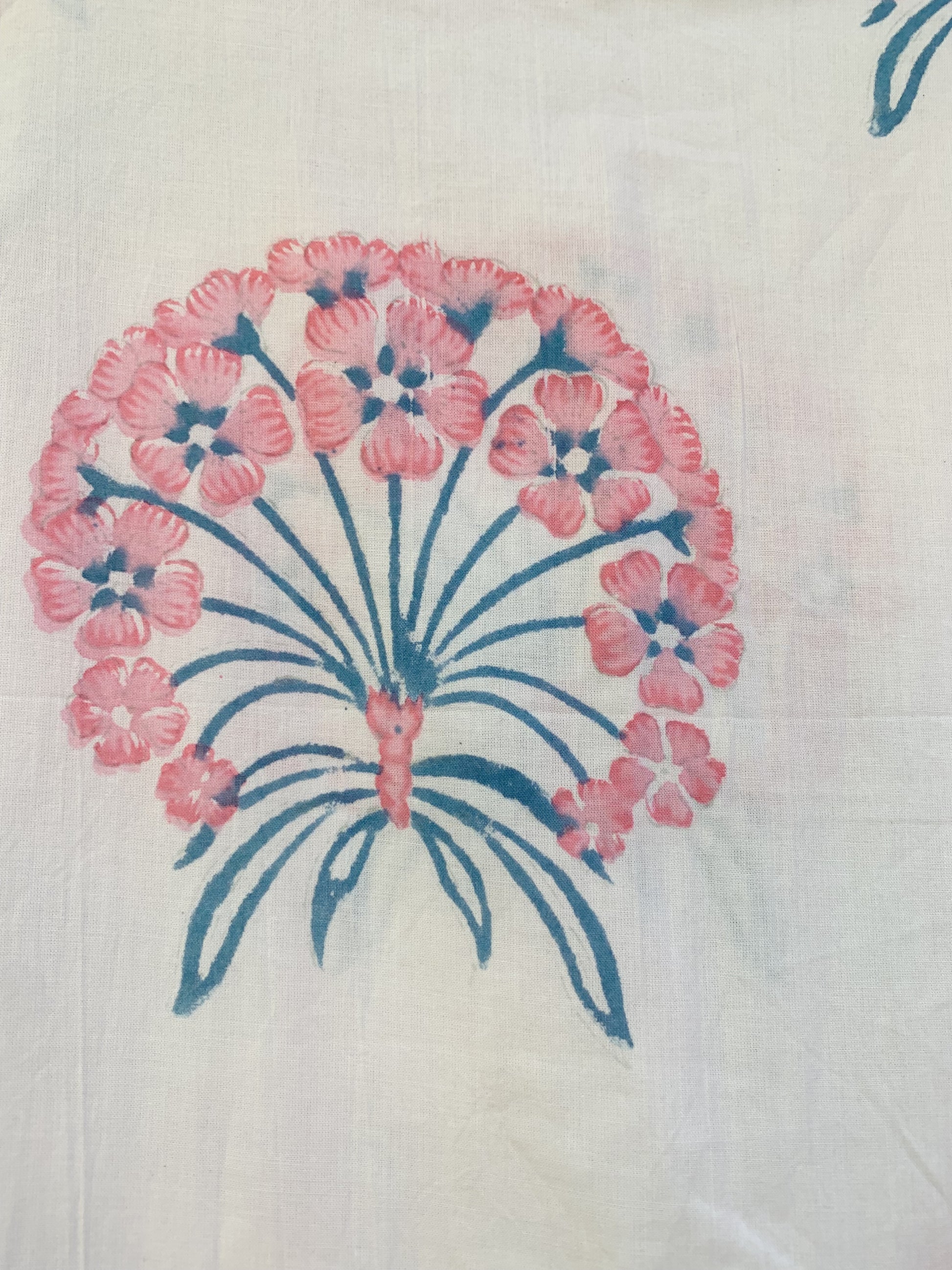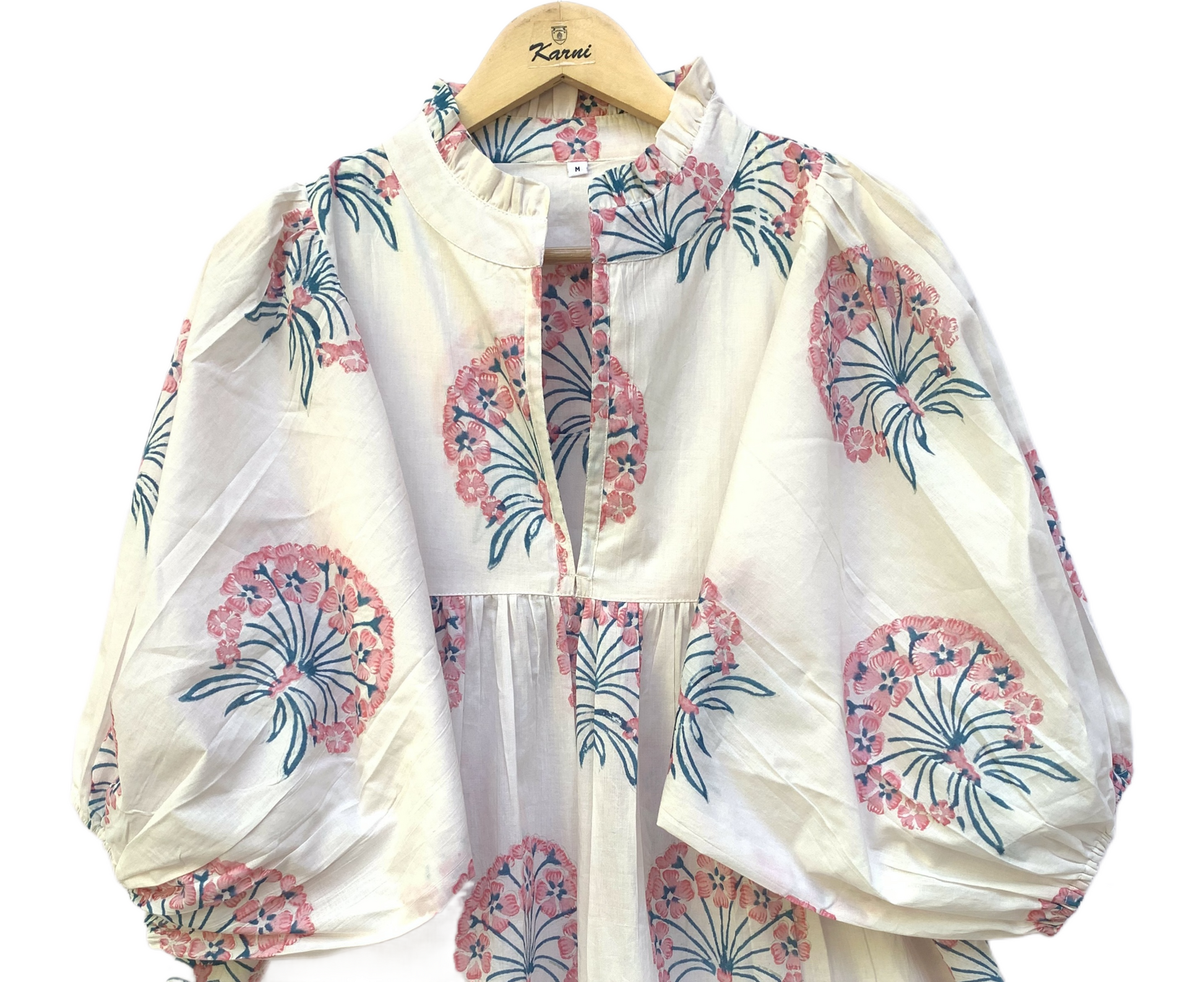 Ivory Pink Floral Block Print Cotton Midi Dress – Boho Handmade Tiered Dress with Puff Sleeves