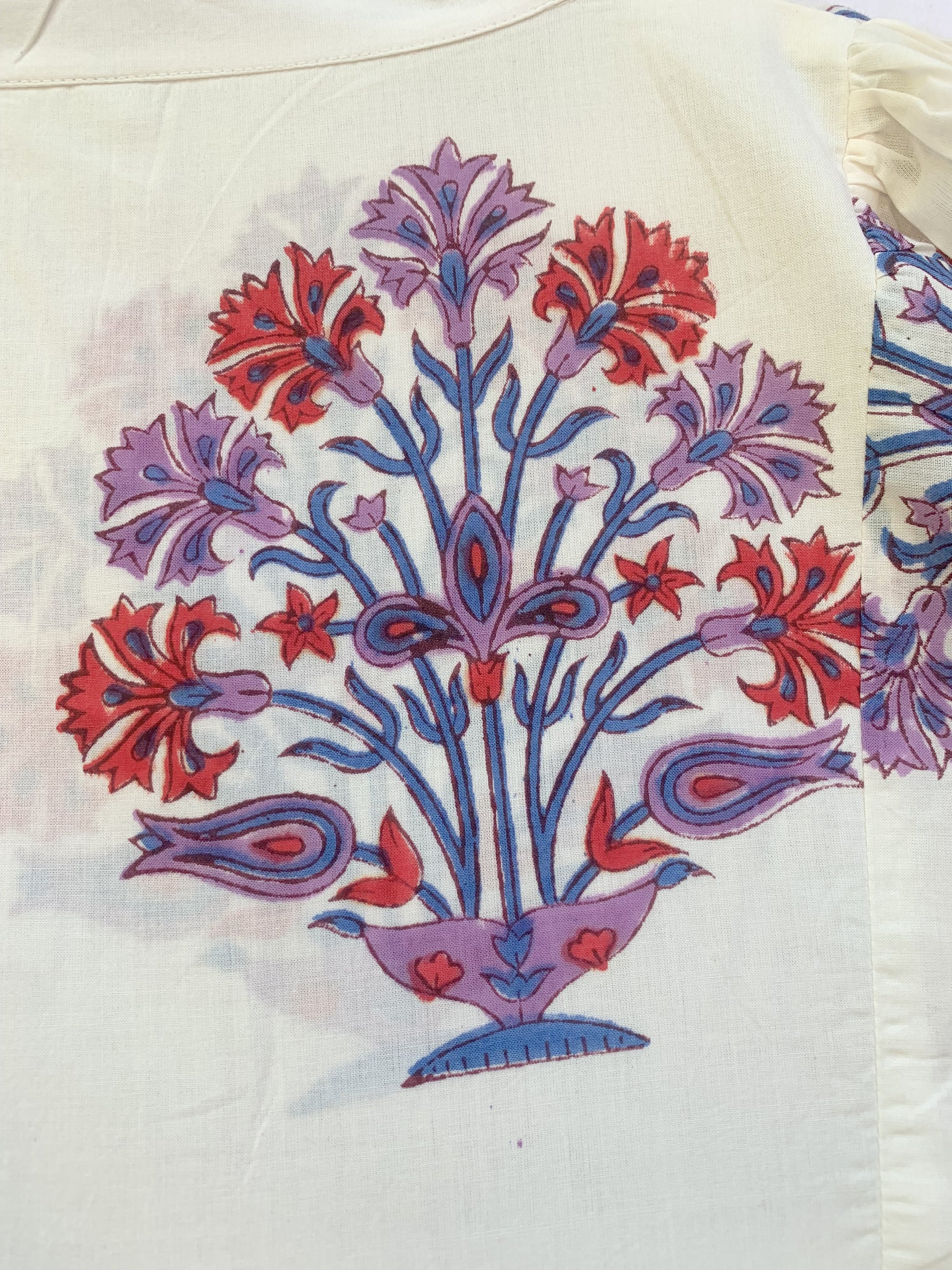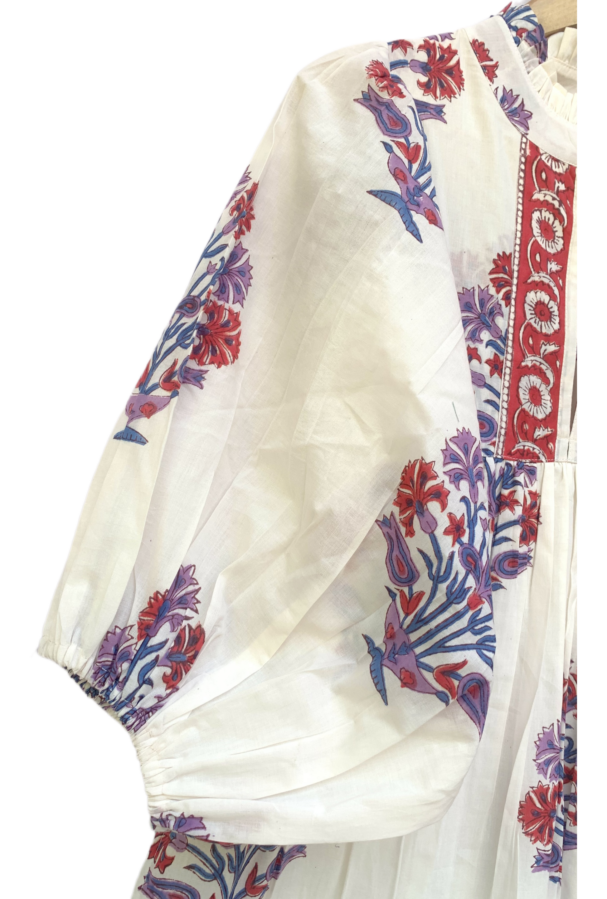 Ivory Red Blue Floral Block Print Cotton Midi Dress – Boho Handmade Tiered Dress with Puff Sleeves & Contrast Yoke