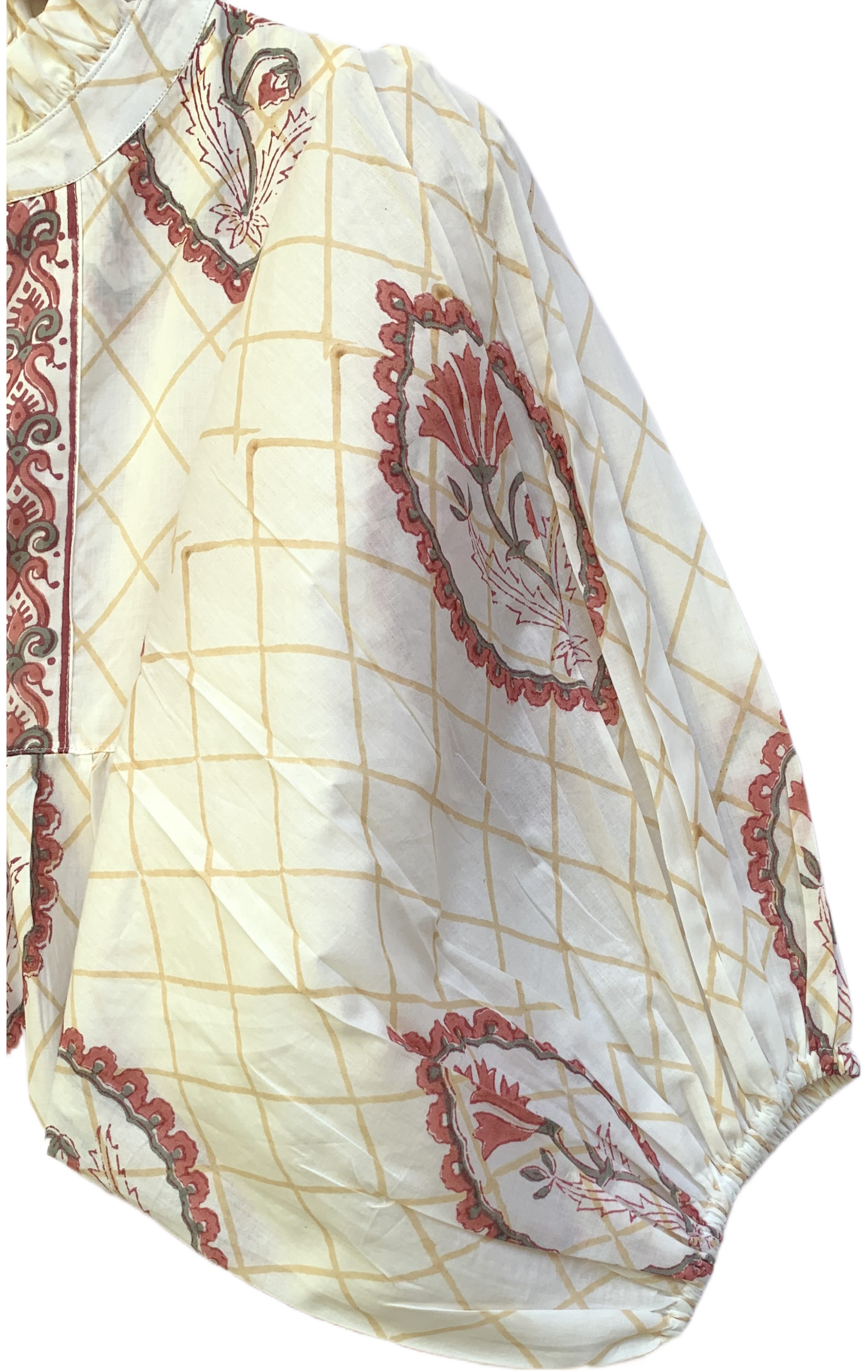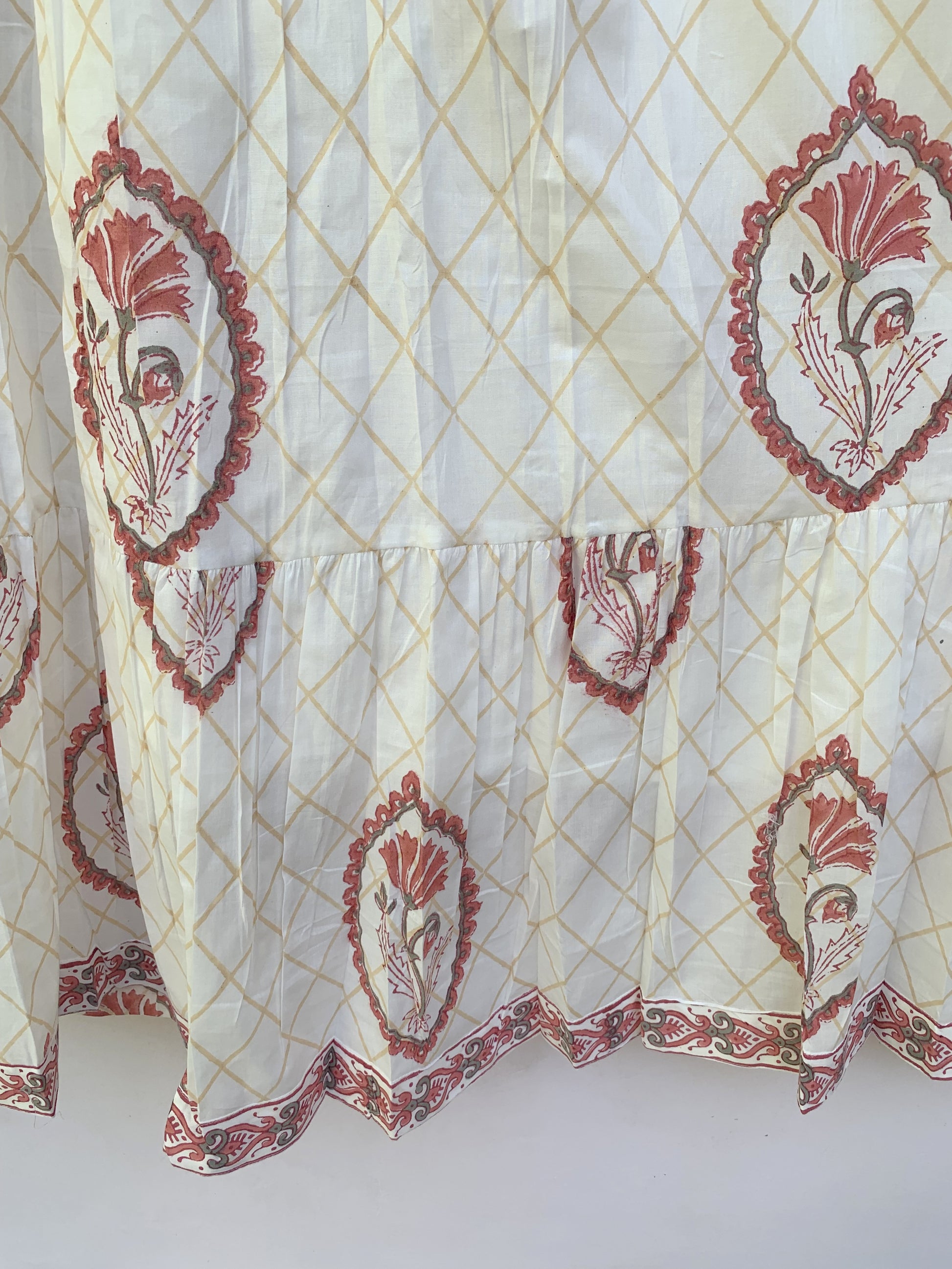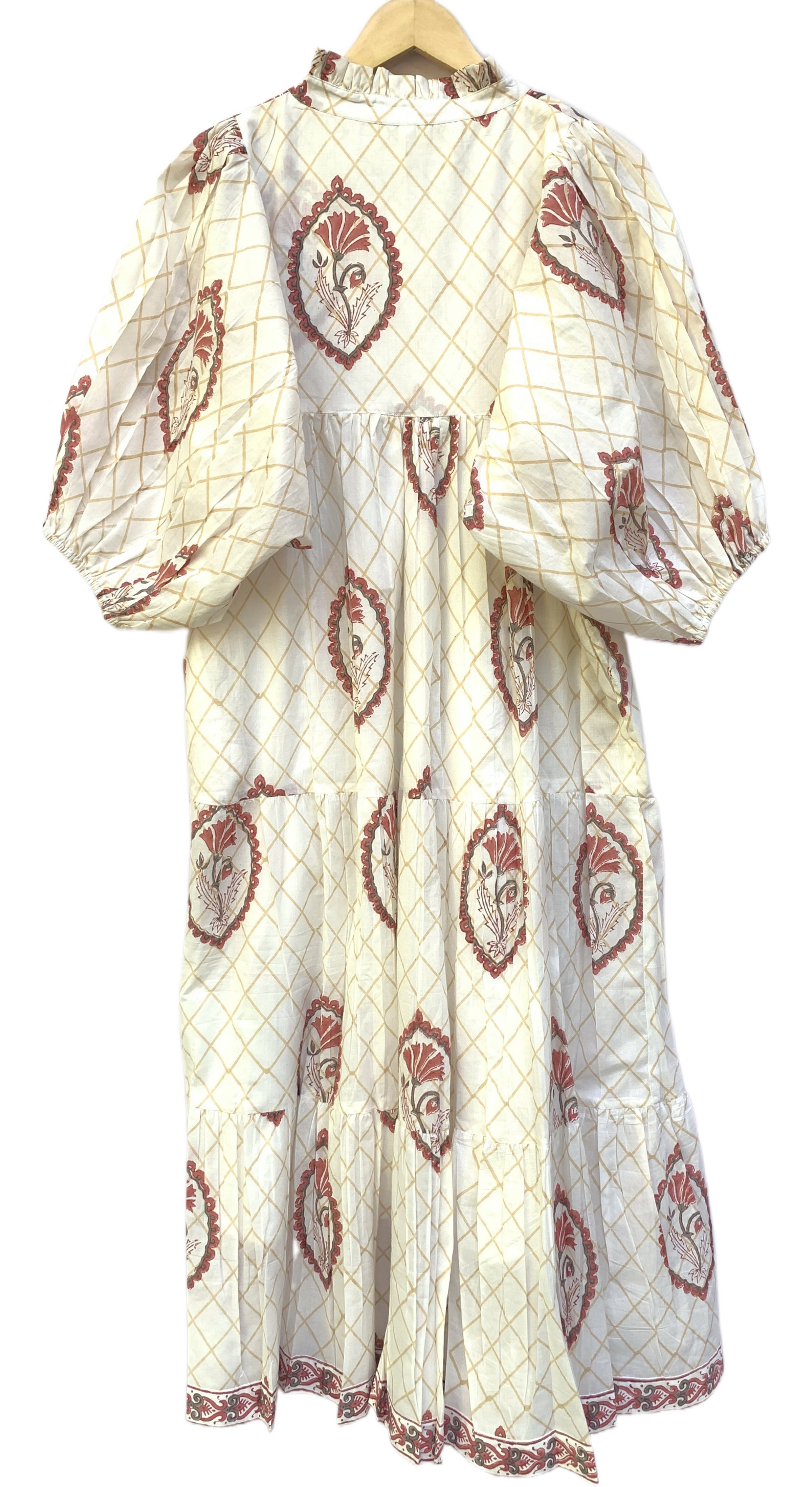 Ivory Red Floral Block Print Cotton Midi Dress – Boho Handmade Tiered Dress with Puff Sleeves & Contrast Yoke