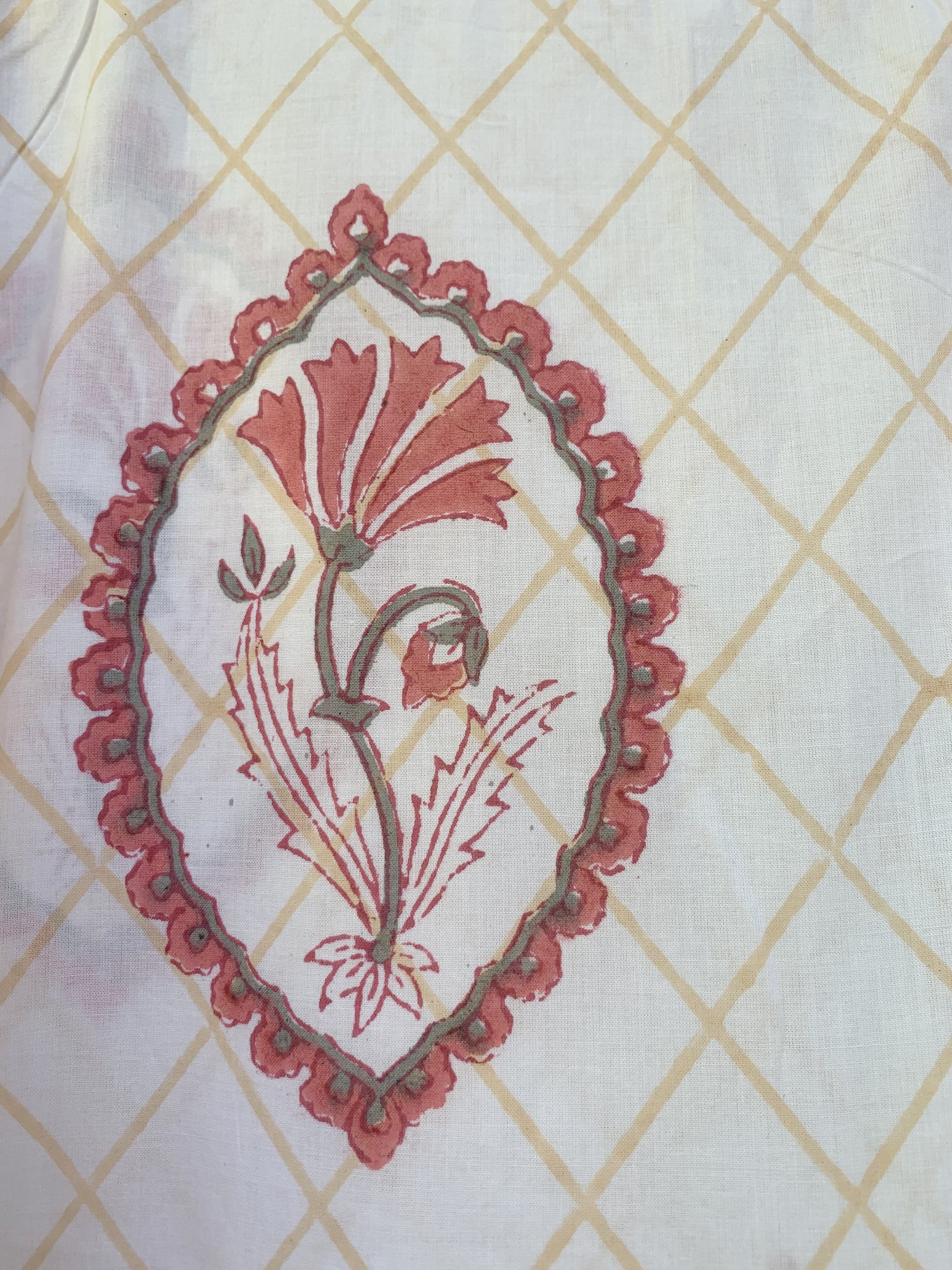 Refresh your wardrobe with this beautifully crafted ivory floral midi dress, hand block printed by skilled artisans using traditional techniques. Featuring red and taupe motifs framed within geometric lattice patterns, this dress blends timeless Indian craftsmanship with a soft, boho silhouette.