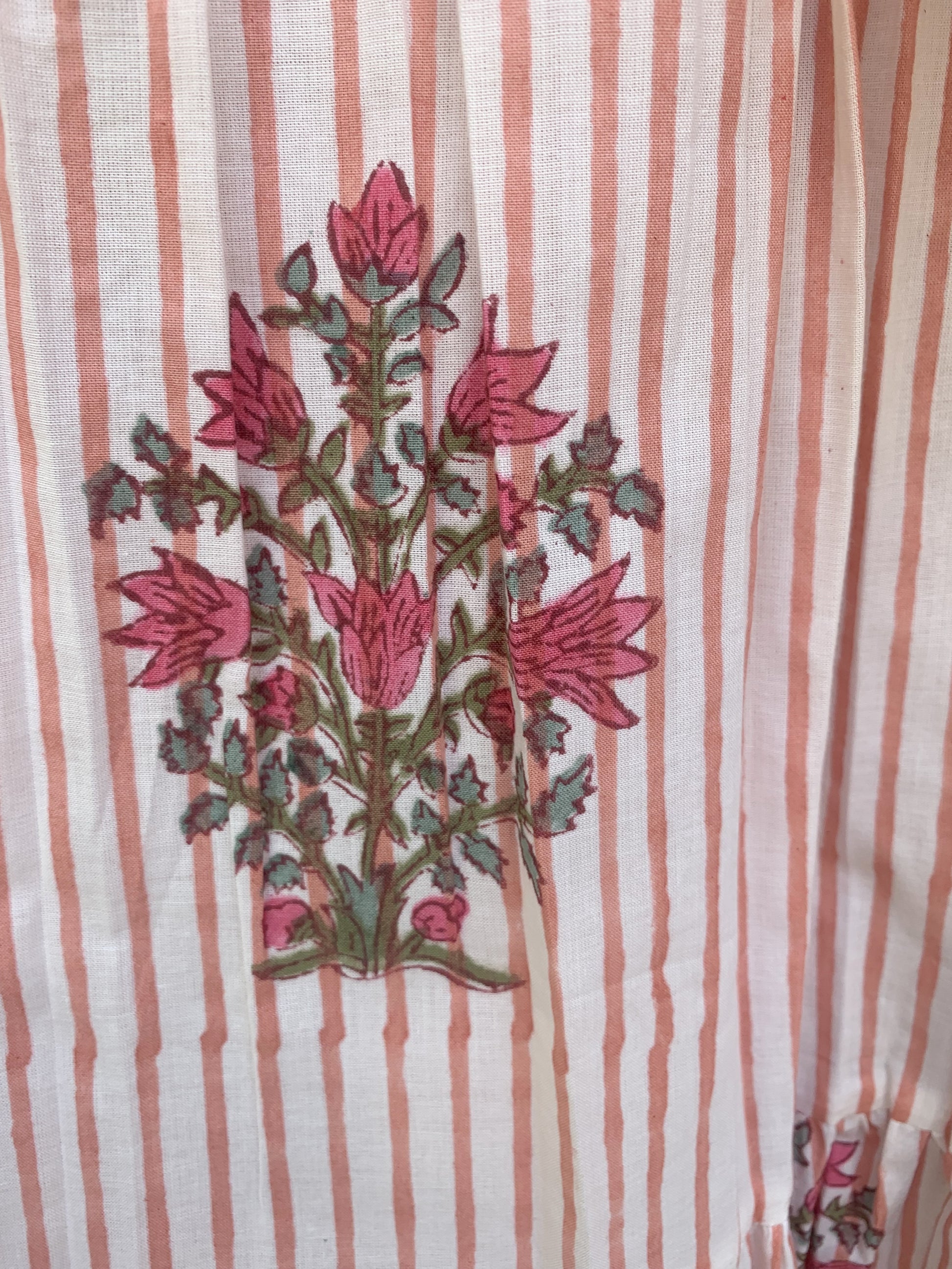 Ivory Red Floral Stripe Block Print Cotton Midi Dress – Boho Handmade Tiered Dress with Puff Sleeves