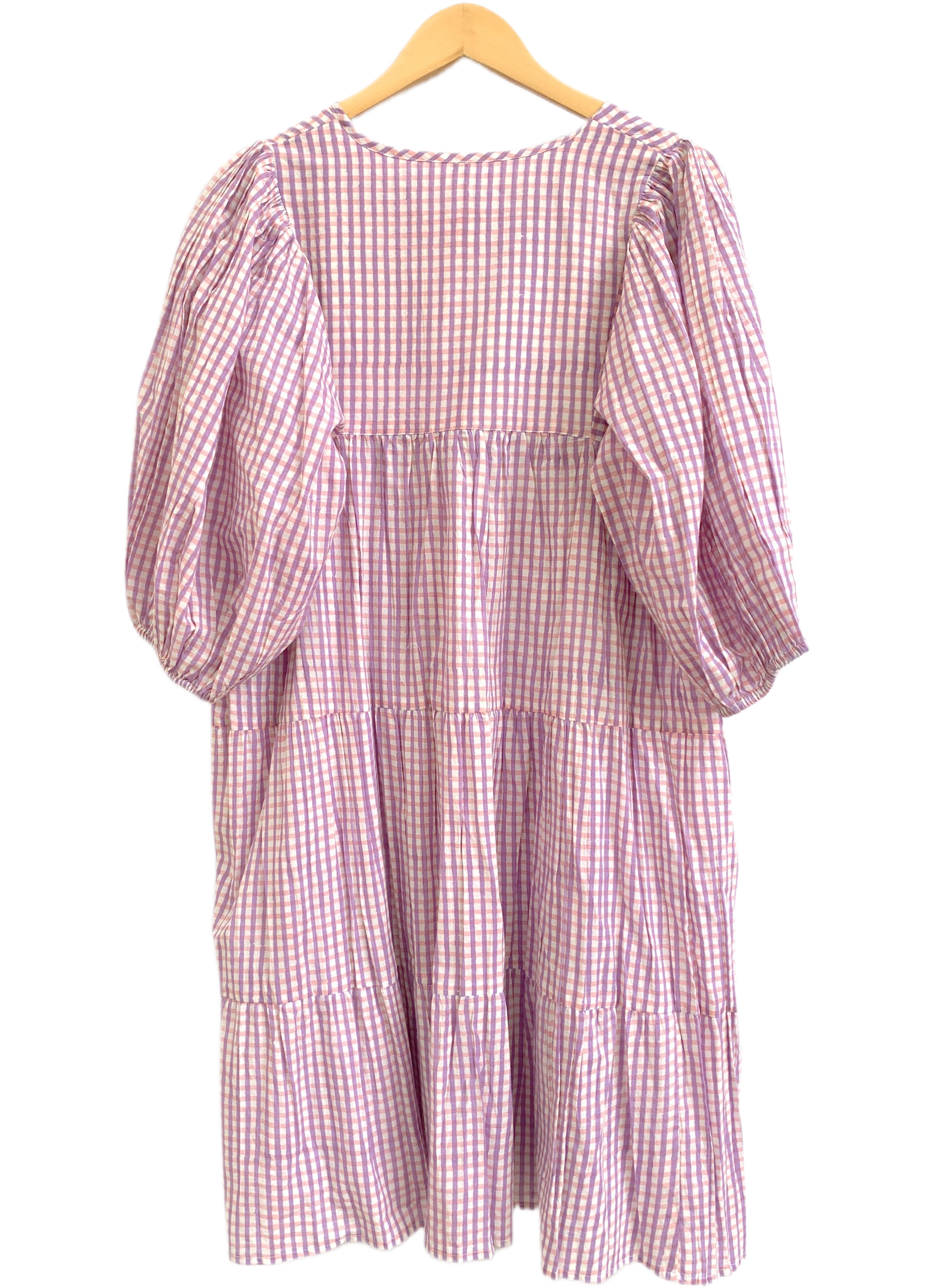 Lavender Gingham Cotton Mini Dress – Boho Tiered Puff Sleeve Tassel Tie Neck