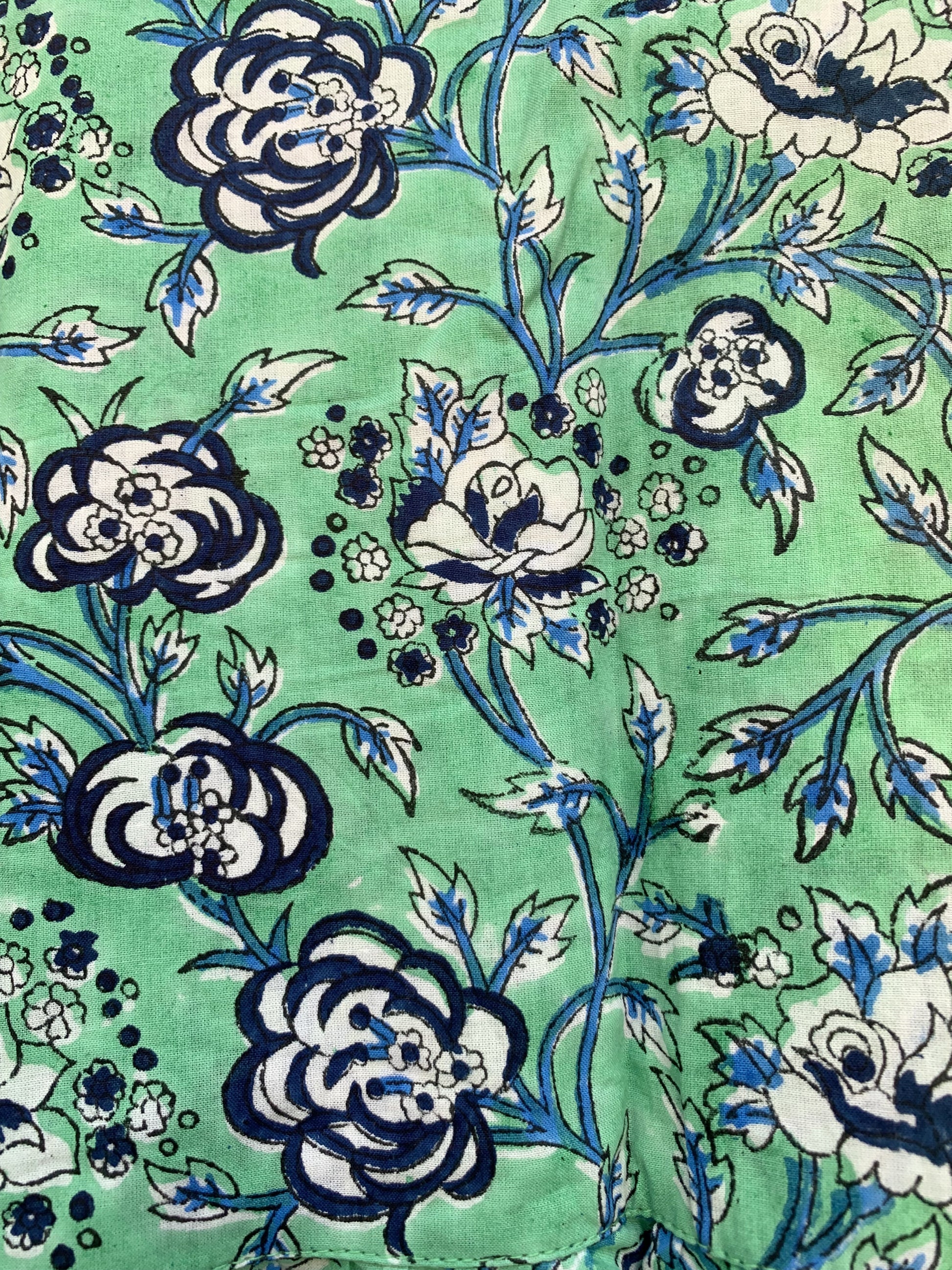 Pattern: Hand block printed floral motifs on a mint green base