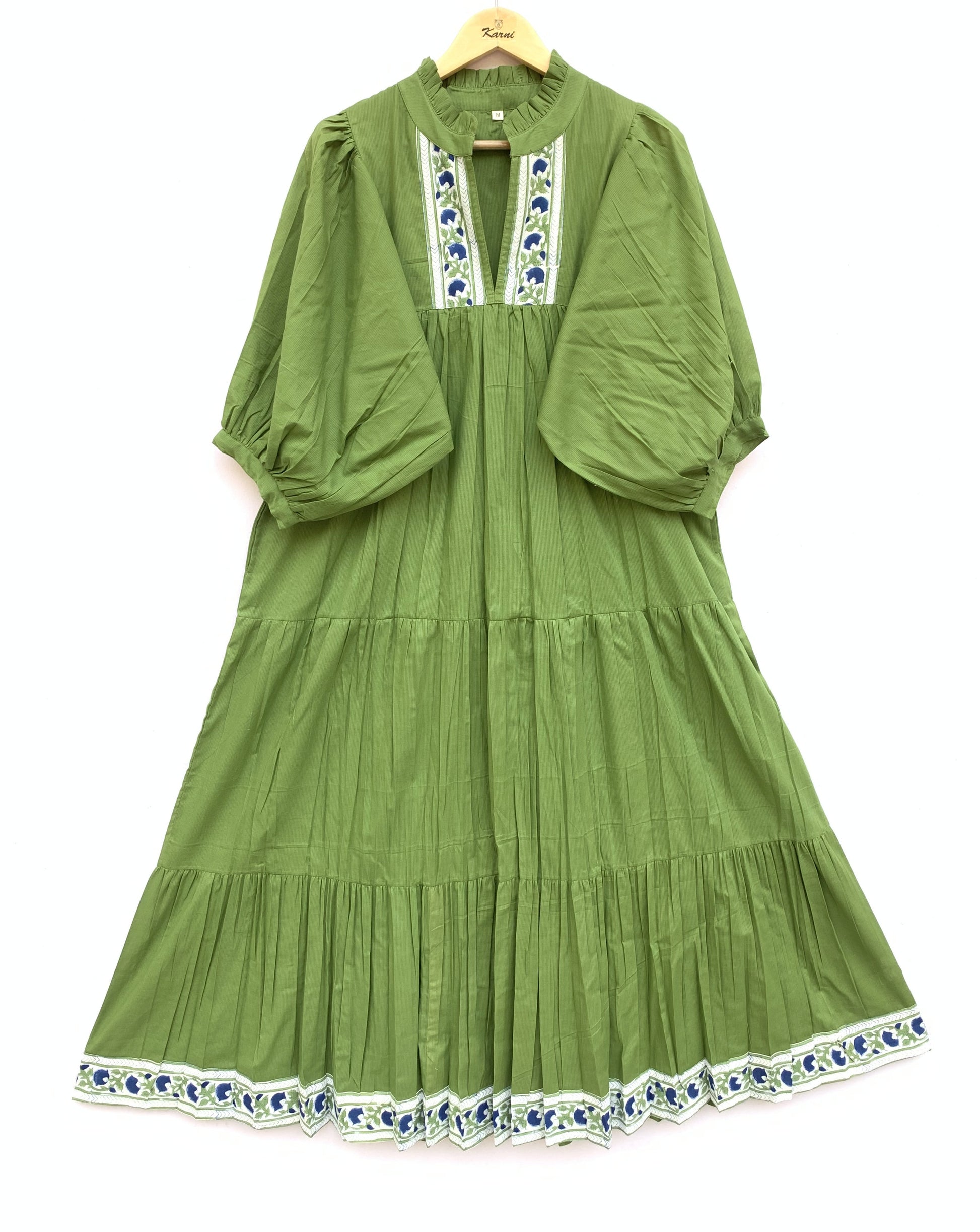 Olive Green Cotton Maxi Dress – Puff Sleeve Tiered Boho Long Dress with Floral Block Print Border