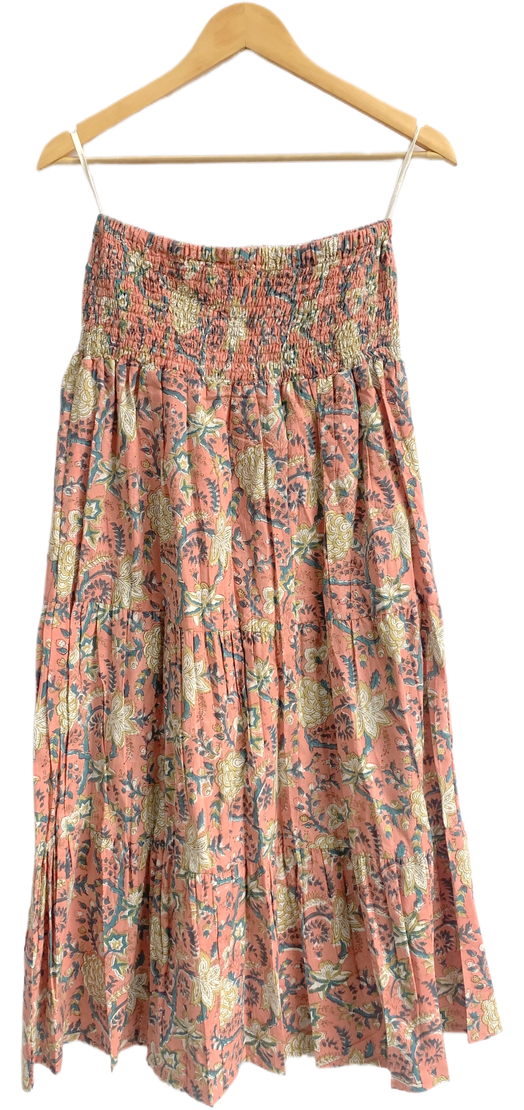 Beautifully handcrafted using traditional wooden block printing techniques, this peach floral cotton maxi skirt is handmade by skilled artisans from Jaipur, India. Designed for comfort and effortless boho style, it features a flattering smocked waistband and a flowing tiered silhouette.