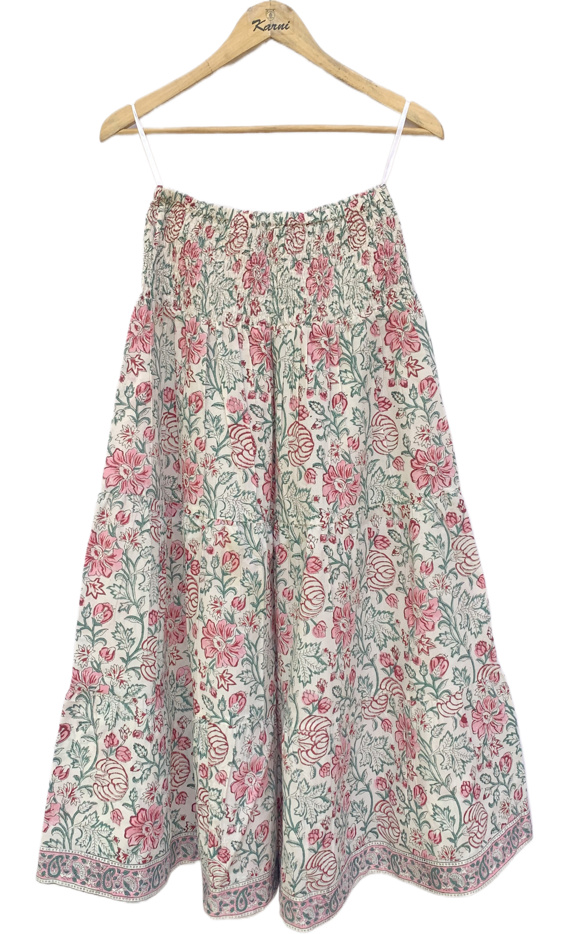 Soft, breezy, and artisanally crafted, this pink and green floral smocked dress is the perfect blend of comfort and boho charm. Made from hand block printed cotton, it features an elasticated smocked bodice and a flowy tiered skirt — ideal for beach days, relaxed weekends, or summer getaways.