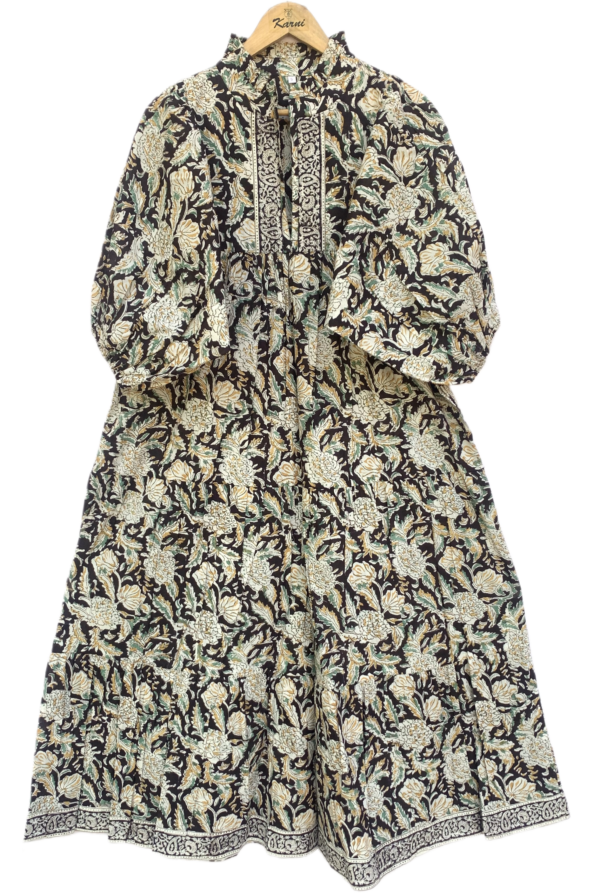 Pink Purple Floral Stripe Block Print Cotton Midi Dress – Boho Handmade Tiered Dress with Puff Sleeves & Contrast Yoke
