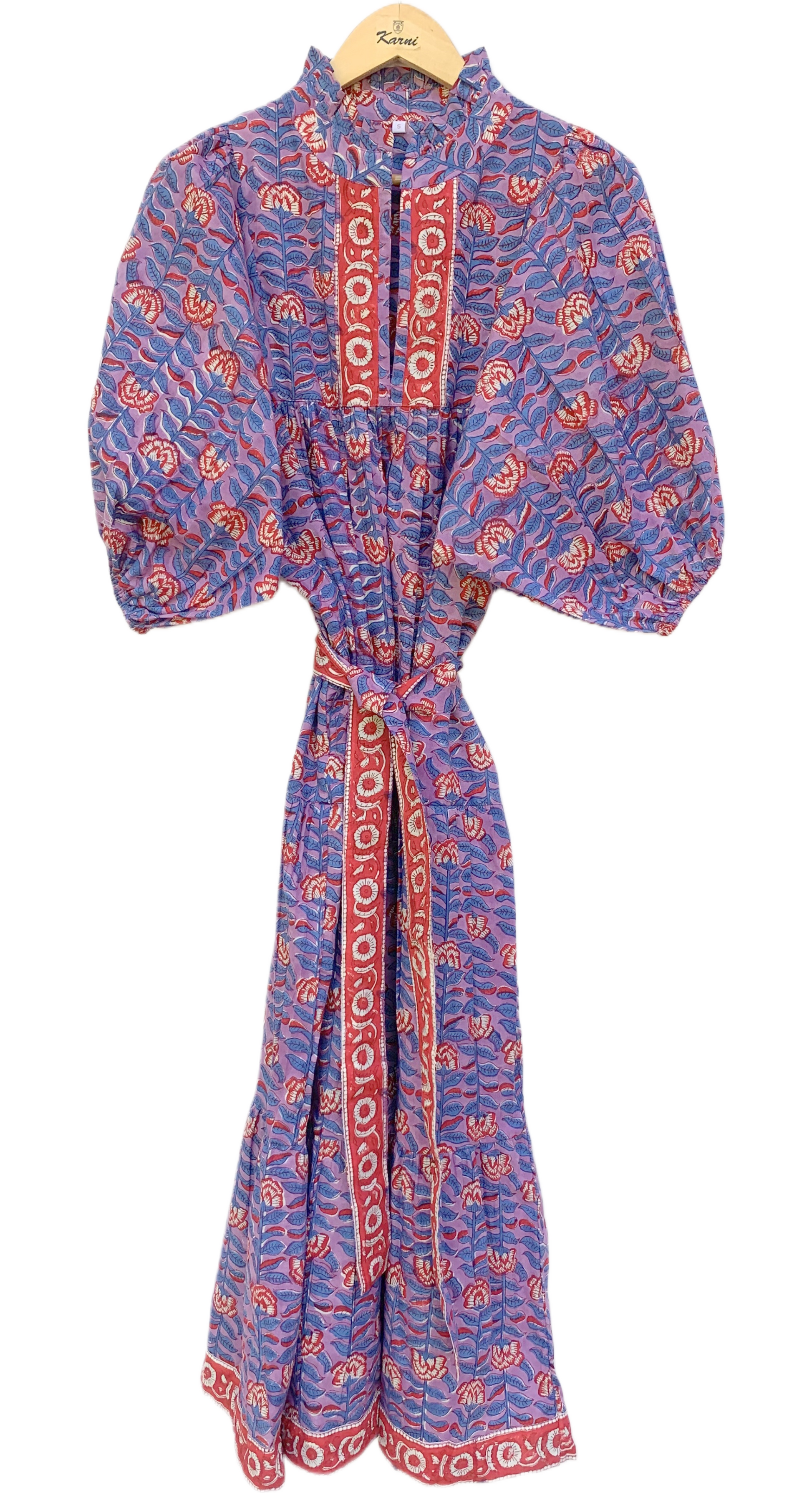Bring vibrant artisanal charm to your wardrobe with this beautifully crafted purple floral midi dress, hand block printed by skilled artisans using traditional wooden blocks. Featuring rich shades of purple, red, and blue with detailed floral motifs, this dress stands out with its bold boho aesthetic.