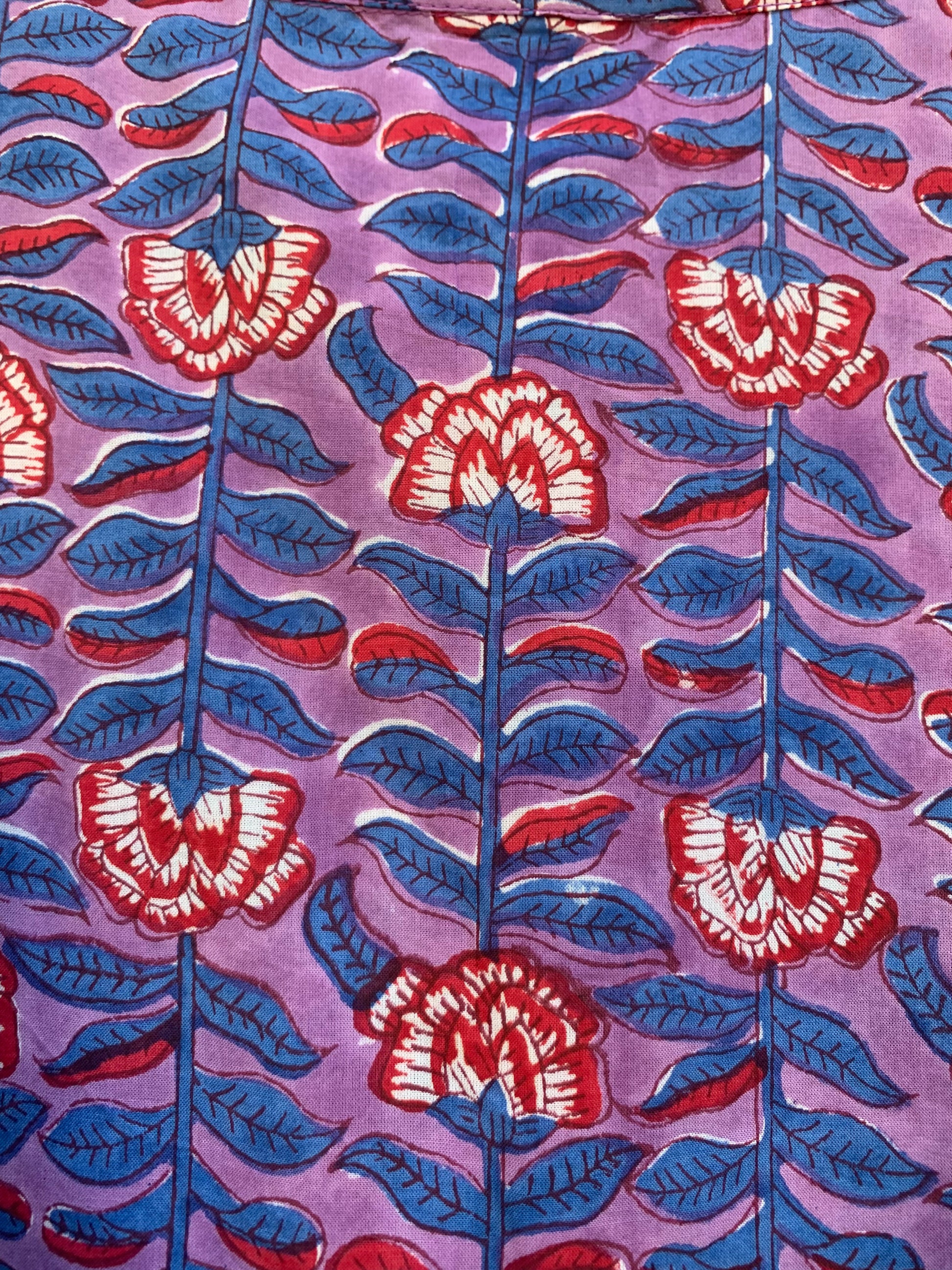 Hand block printed with detailed purple, red & blue floral motifs
