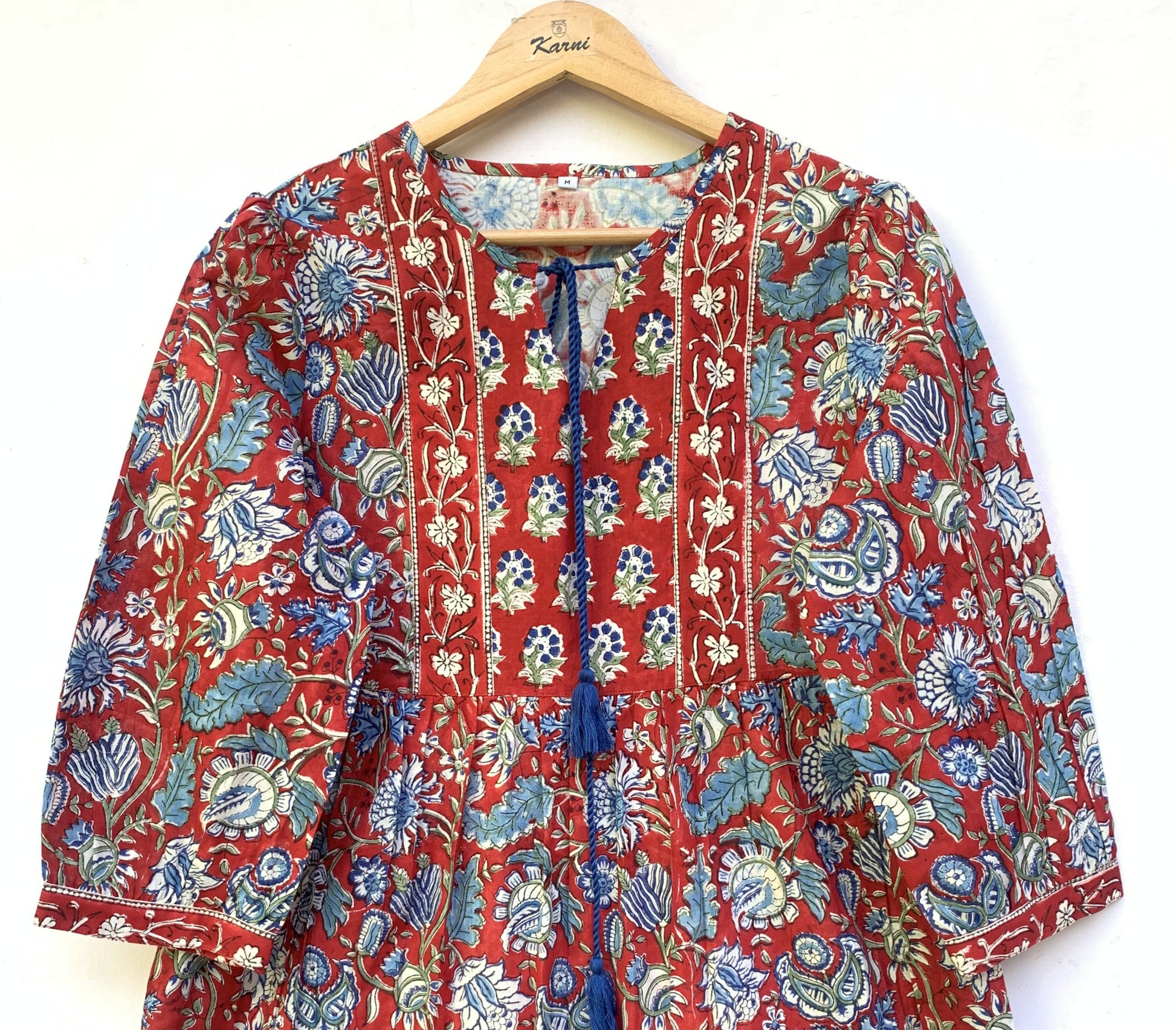 Red Blue Floral Block Print Cotton Dress – Handcrafted Boho Midi Dress with Tassel Tie Neck