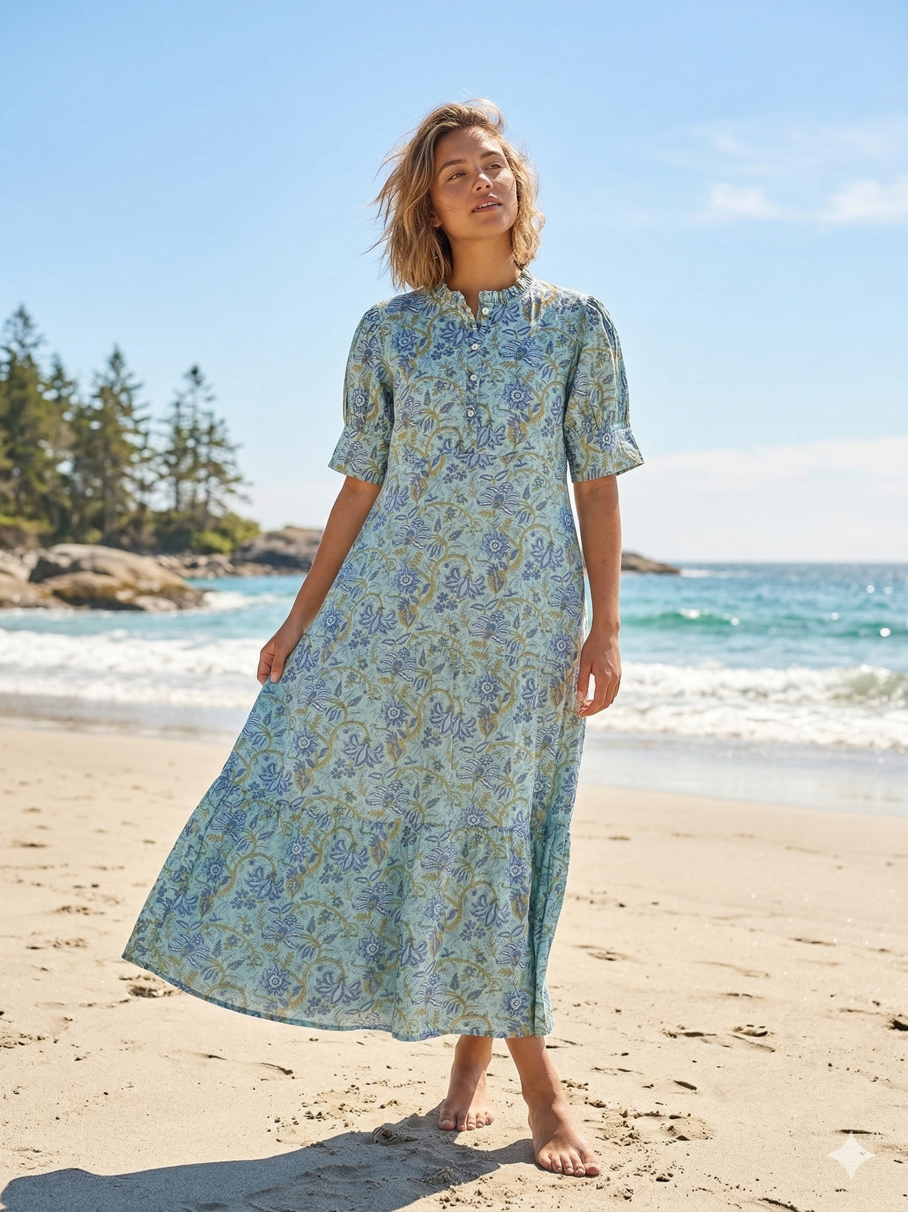 Sage Blue Floral Hand Block Print Cotton Maxi Dress – Boho Summer Dress with Puff Sleeves