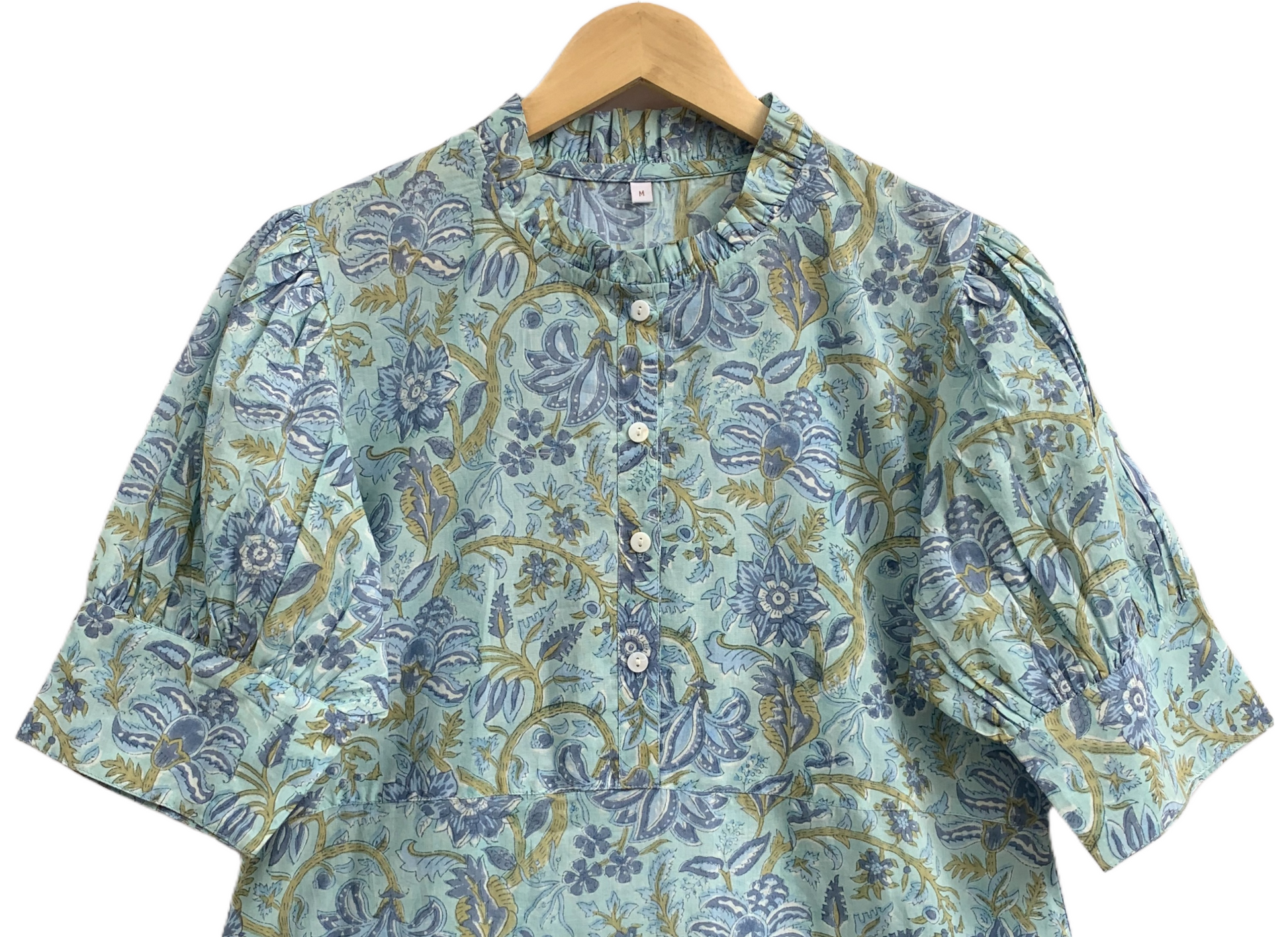 Handcrafted by skilled artisans in India using traditional hand block printing techniques, each piece reflects authentic craftsmanship with subtle variations that make it uniquely yours. Designed with a relaxed tiered silhouette and soft puff sleeves, it offers breathable comfort and graceful movement.
