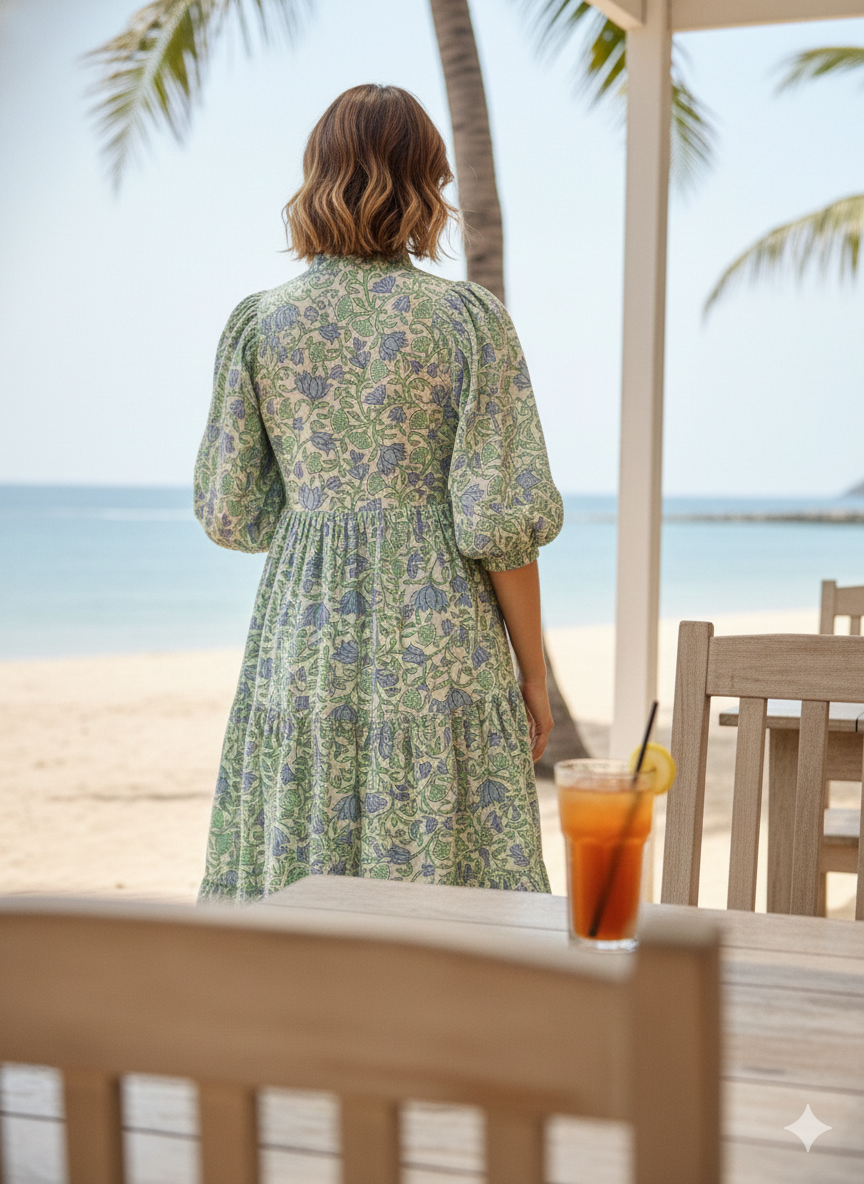 Sage Green Blue Floral Hand Block Printed Cotton Midi Dress – Puff Sleeve Boho Indian Dress