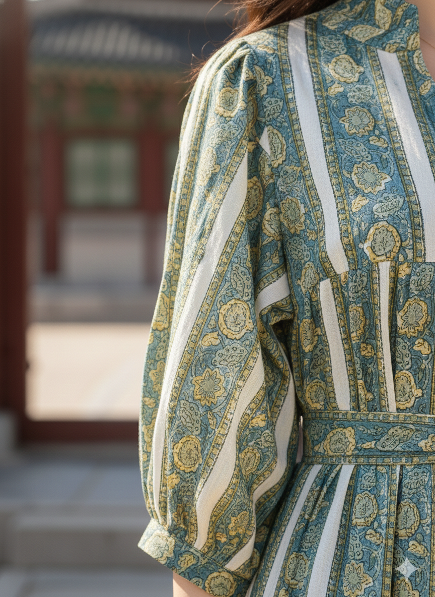 Soft, feminine, and beautifully handcrafted, this sage green floral striped hand block printed cotton midi dress is a calm and elegant addition to any boho-inspired wardrobe. Set on a soothing sage green base with delicate floral motifs and vintage-inspired stripe detailing, this dress celebrates the timeless beauty of traditional Indian hand block printing with relaxed, everyday bohemian charm.