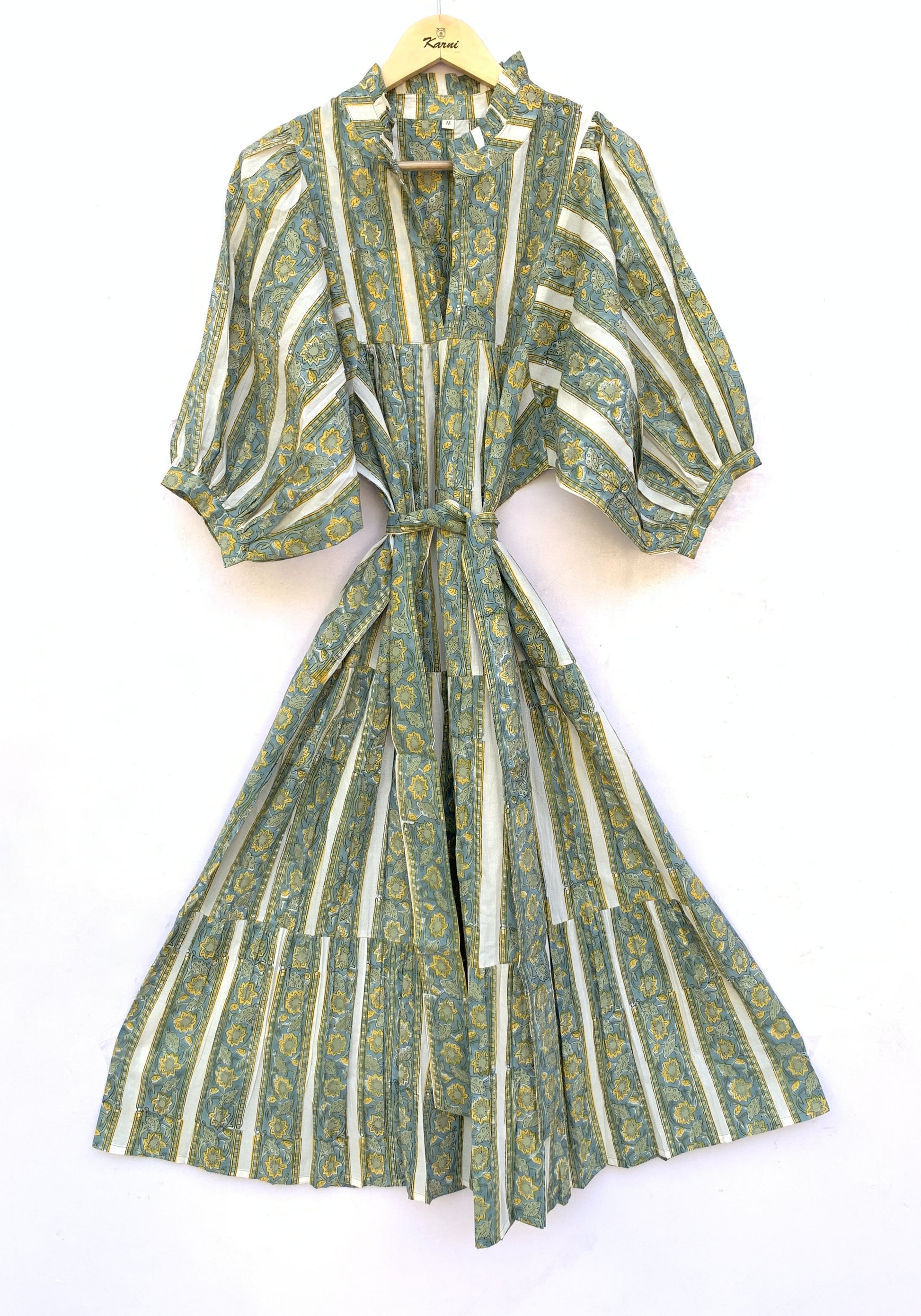 Sage Green Floral Striped Hand Block Printed Cotton Midi Dress – Boho Tiered Long Sleeve Indian Dress