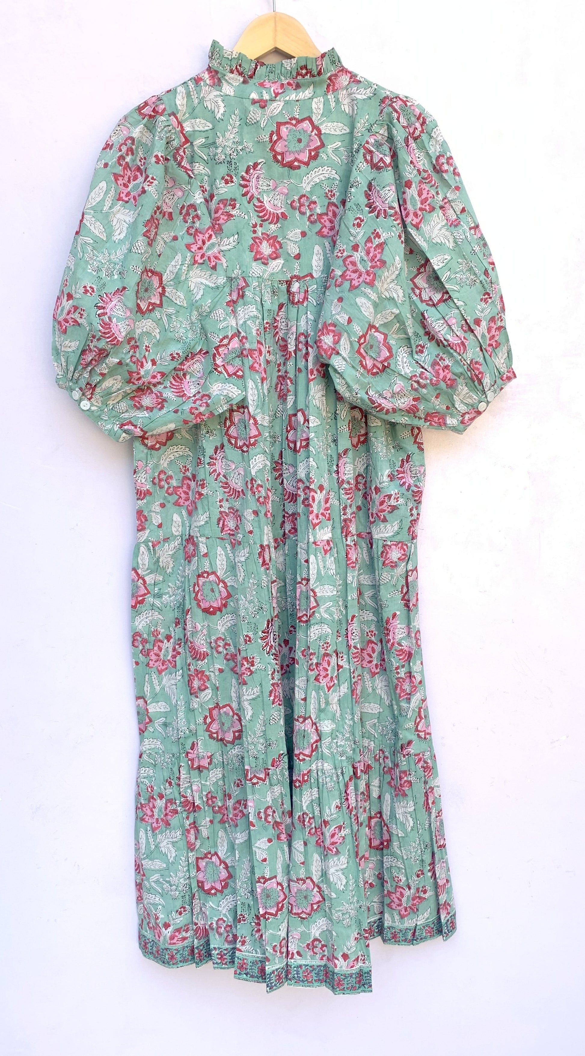 Sage Green Pink Floral Hand Block Printed Cotton Midi Dress – Boho Tiered Long Sleeve Indian Dress