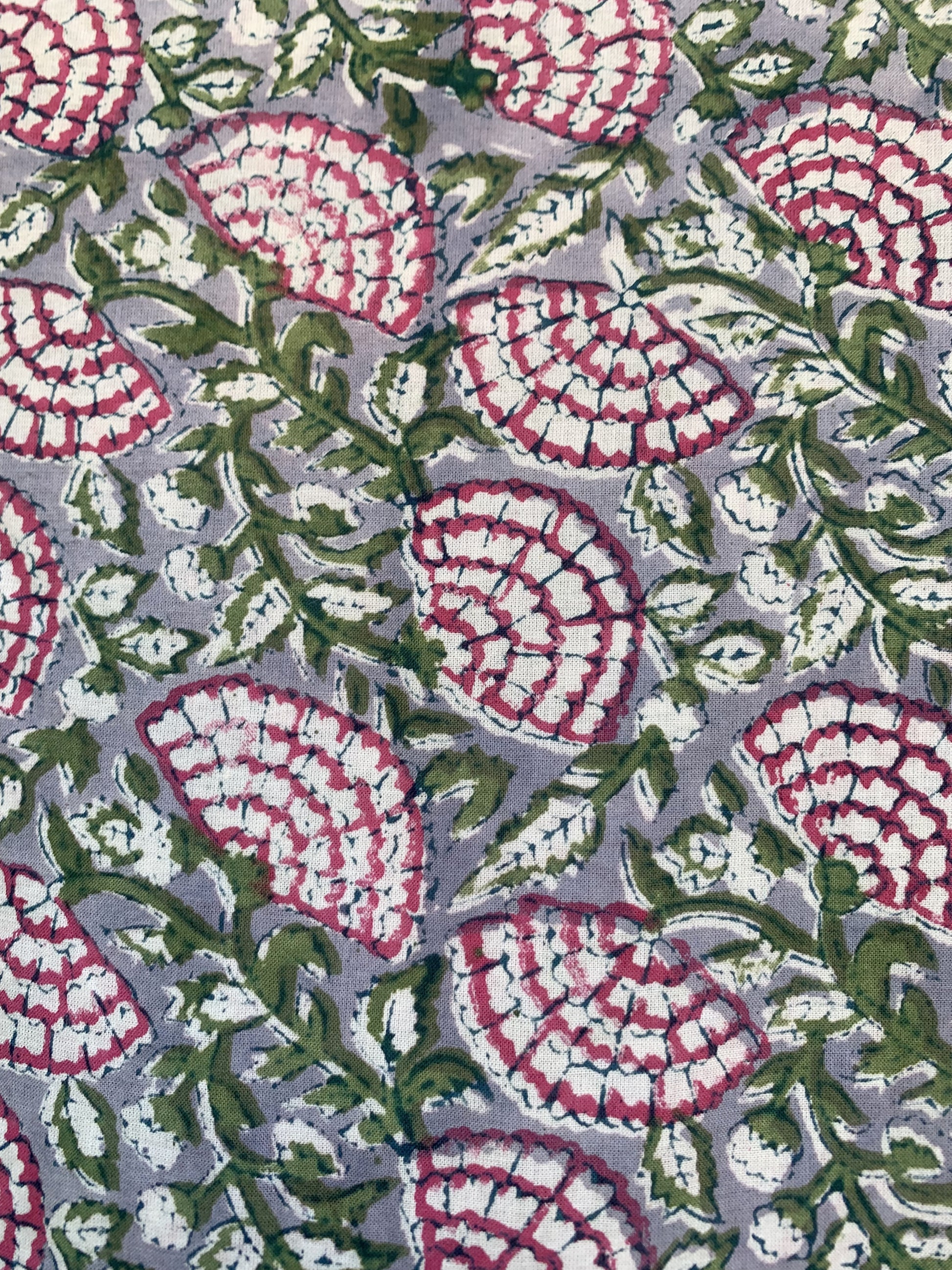 Pattern: Hand block printed pink floral motifs on a sage green base