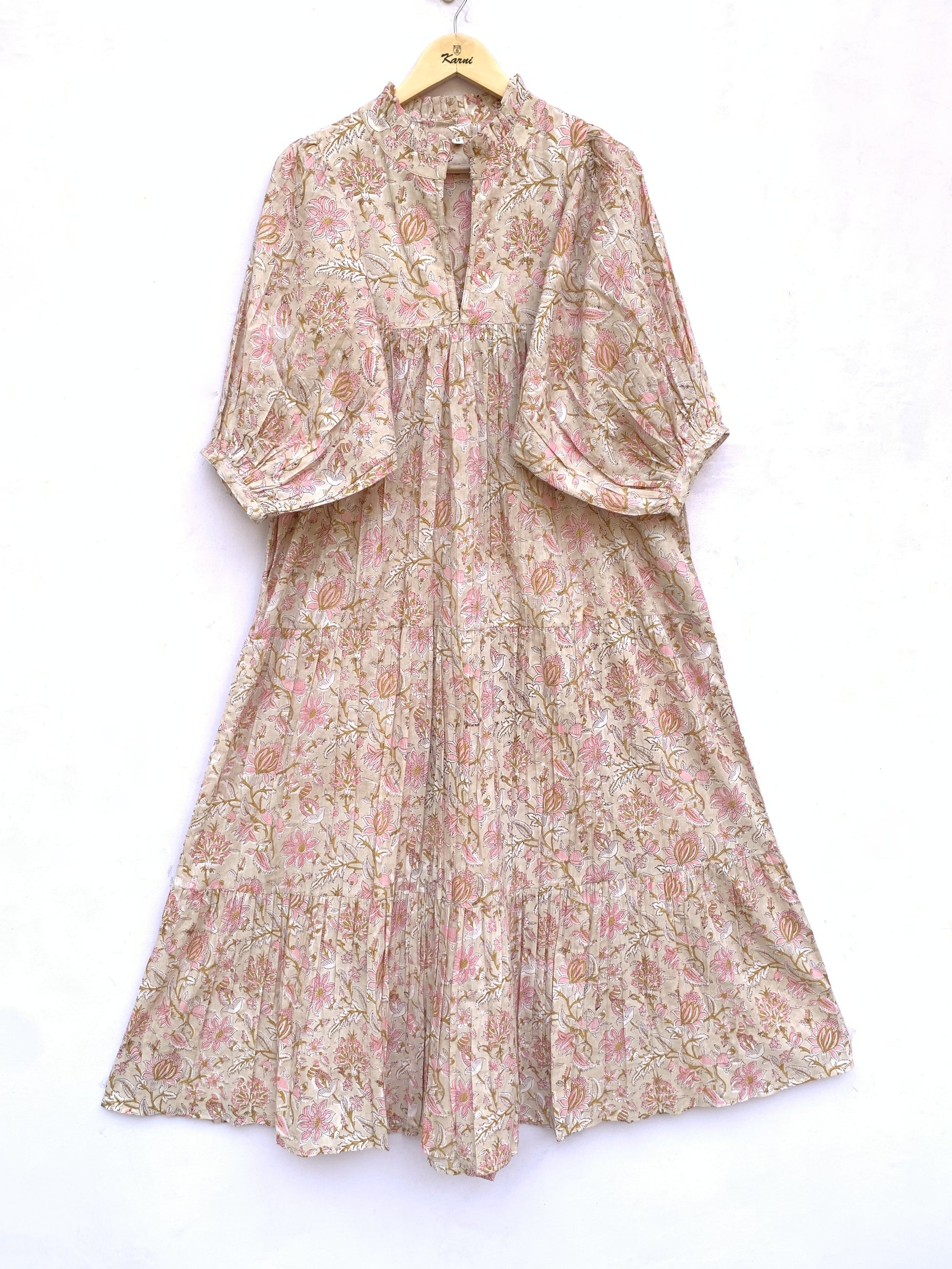 Soft Beige Pink Floral Hand Block Print Cotton Tiered Midi Dress – Bohemian Indian Dress