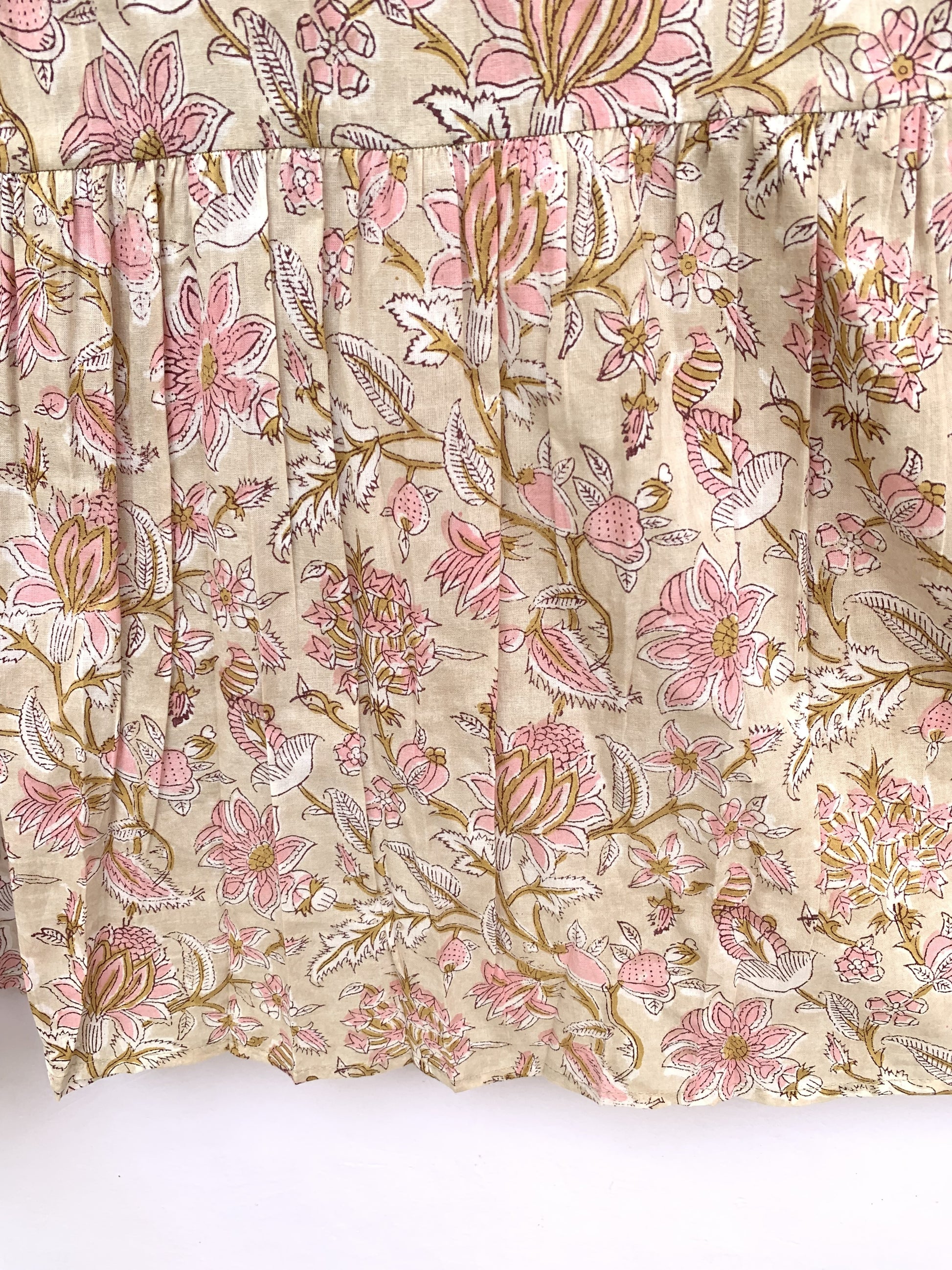• Pattern: Hand block printed floral motifs in soft pink on a beige base