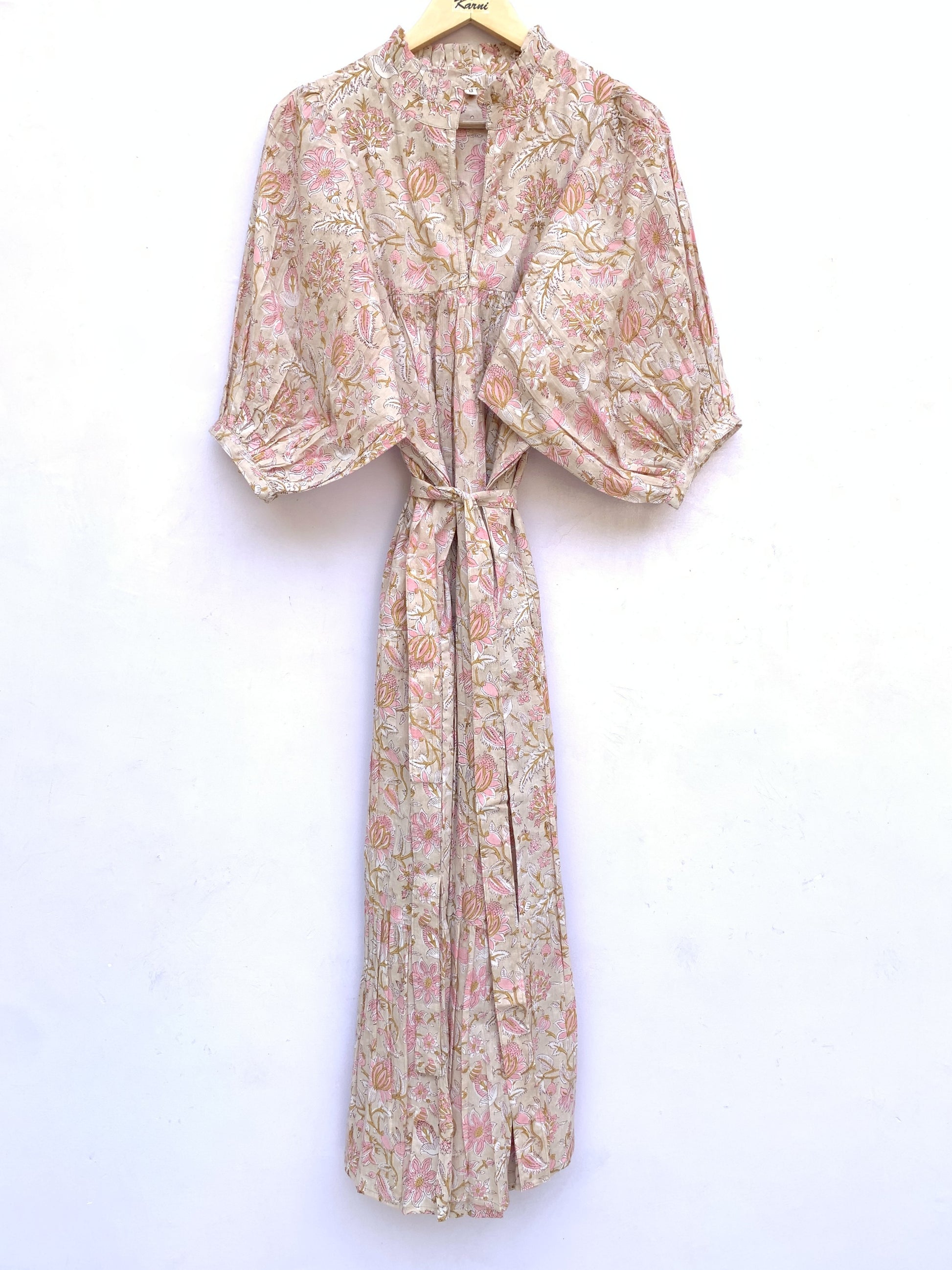 Soft, feminine, and beautifully crafted, this soft beige and pink floral hand block printed cotton midi dress is a graceful addition to a boho-inspired wardrobe. Set on a gentle beige base with delicate pink floral motifs, this dress highlights the timeless beauty of traditional Indian hand block printing paired with relaxed, everyday elegance.