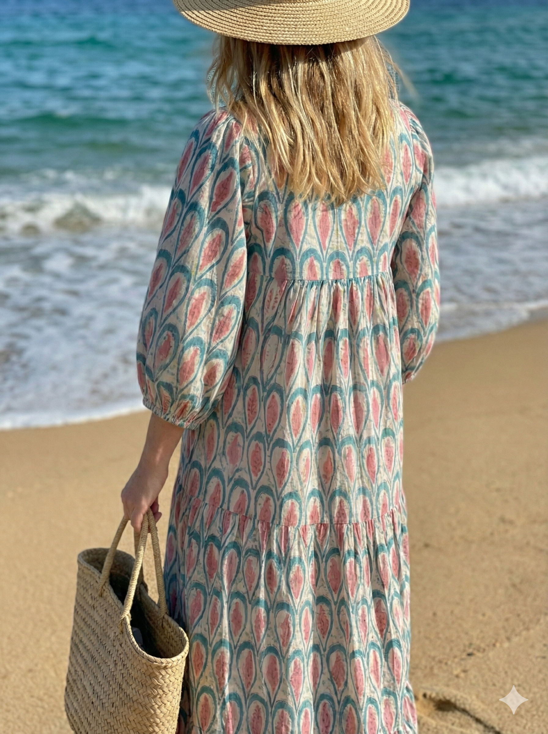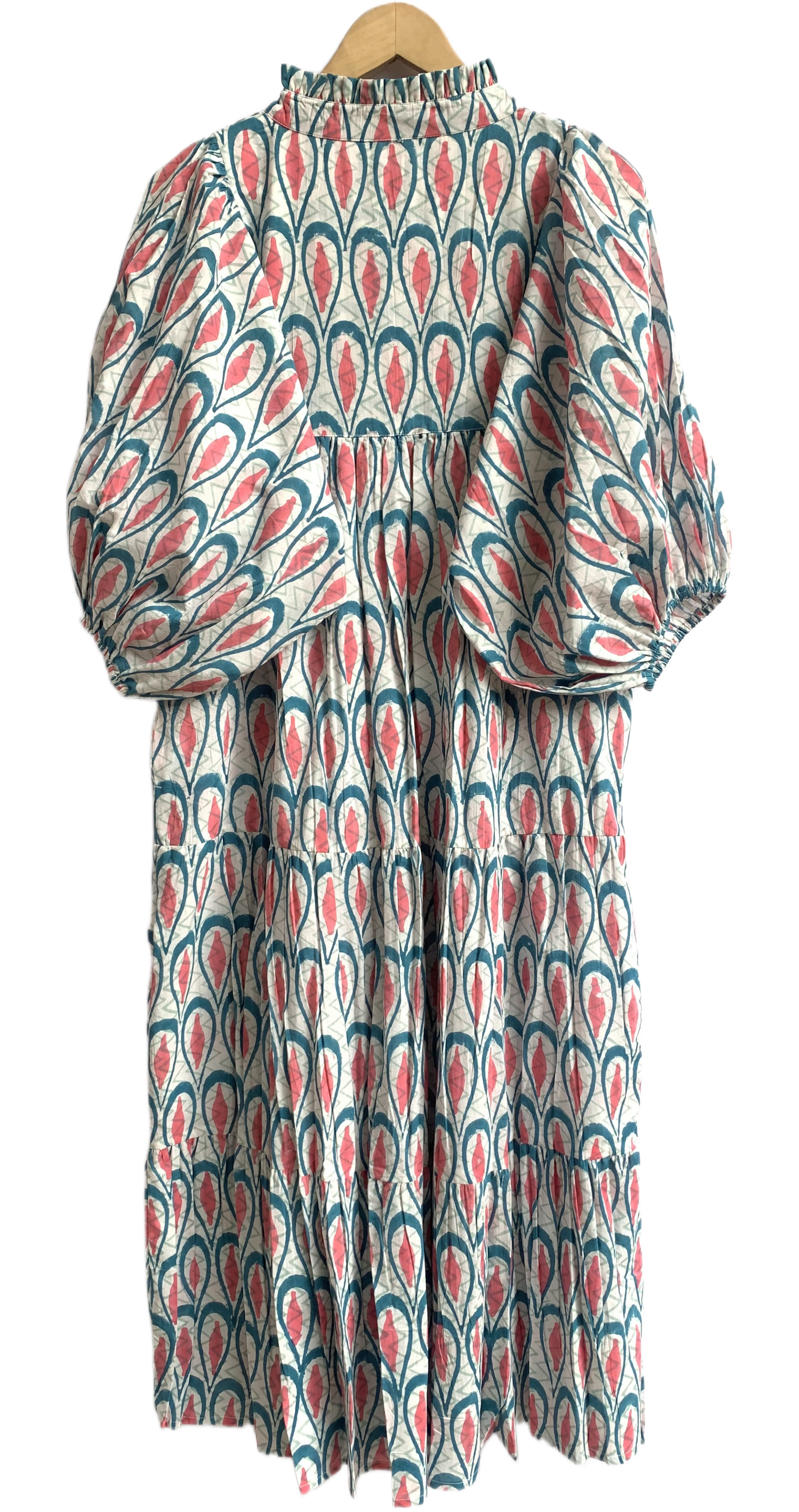 Soft, feminine, and artisan-crafted, this ivory hand block printed cotton dress is a timeless addition to your everyday boho wardrobe. Featuring elegant teal and rose leaf motifs with a relaxed tiered silhouette and voluminous puff sleeves, this dress is designed for effortless comfort and understated elegance—perfect for warm days, travel, and casual outings.