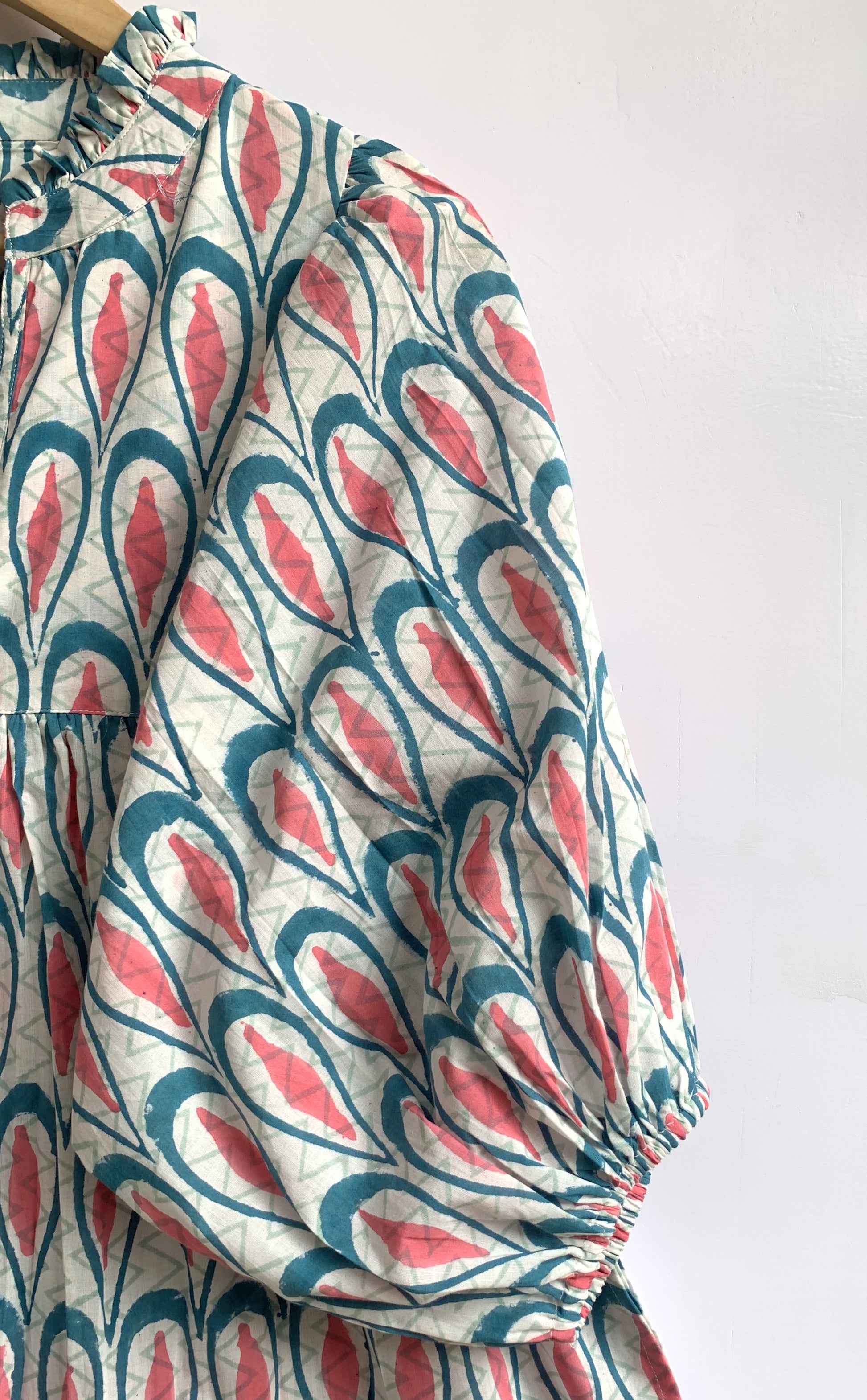 Each piece is hand block printed by skilled artisans in India, celebrating centuries-old craftsmanship and the beauty of slow, handmade fashion.