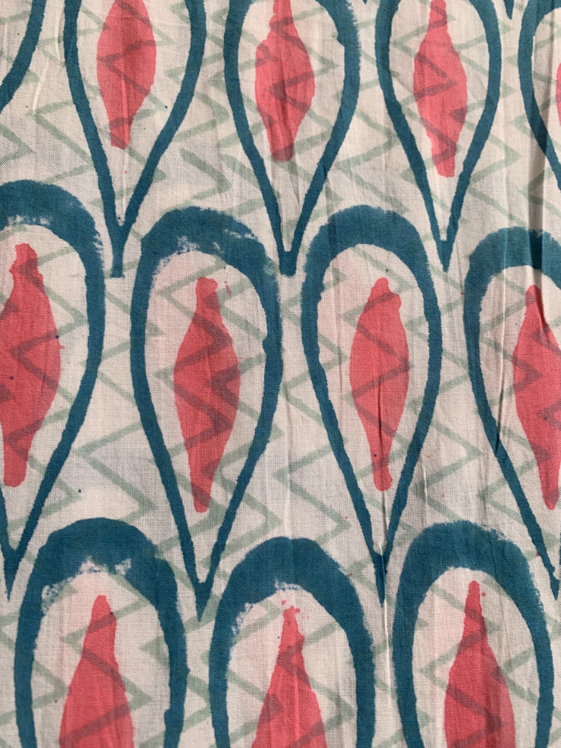 Pattern: Hand block printed leaf motifs in teal & rose tones