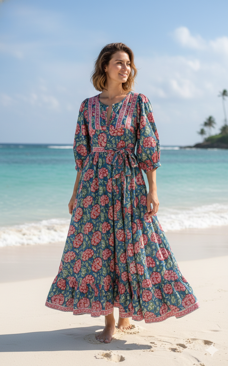Soft, feminine, and artisan-crafted, this teal blue and pink floral hand block printed cotton midi dress is a fresh and elegant addition to a boho-inspired wardrobe. Set on a rich teal blue base with delicate pink floral motifs, this dress highlights the timeless beauty of traditional Indian hand block printing blended with relaxed, everyday bohemian charm.