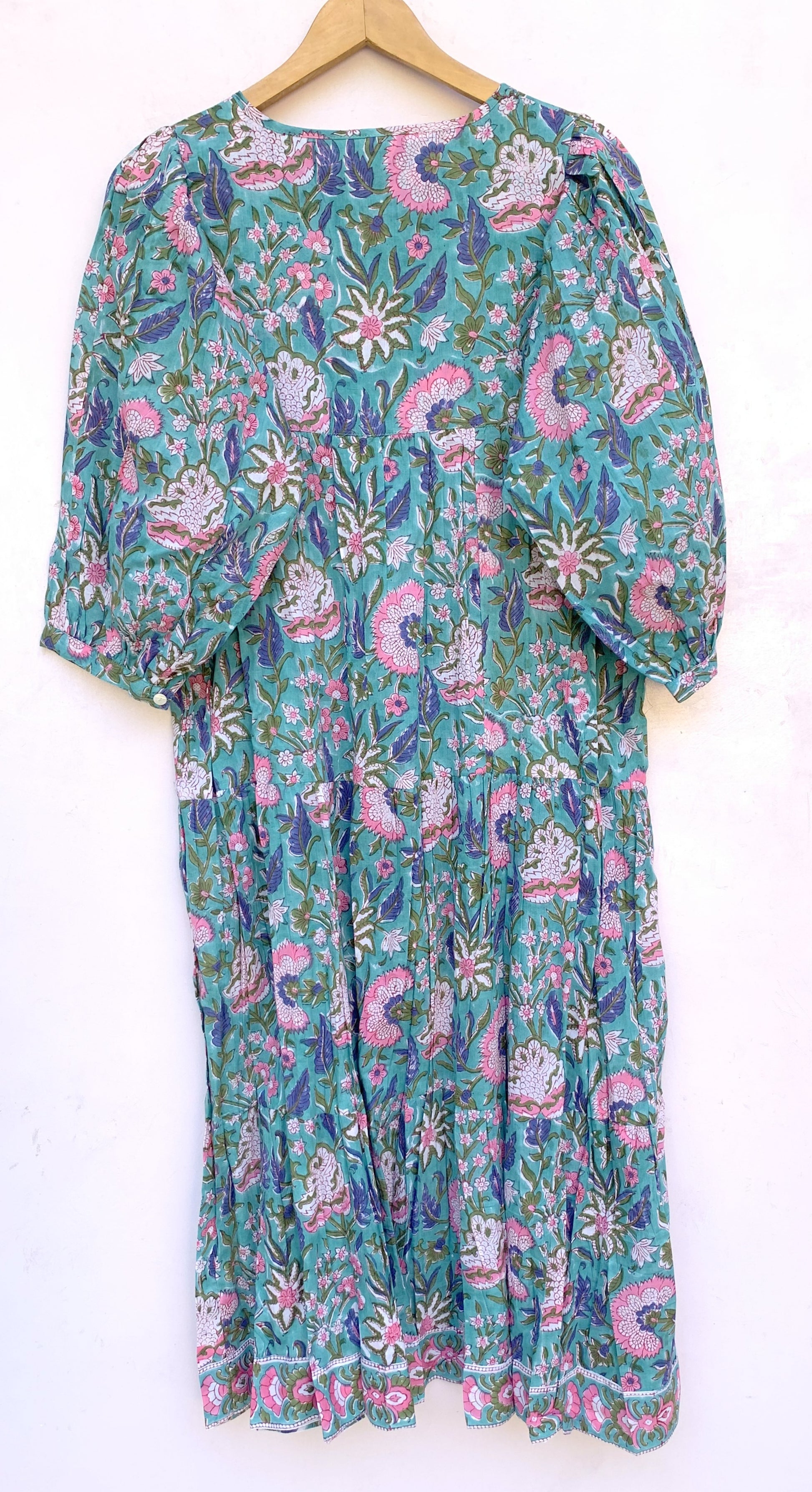 Teal Floral Hand Block Printed Cotton Midi Dress – Puff Sleeve Boho Dress