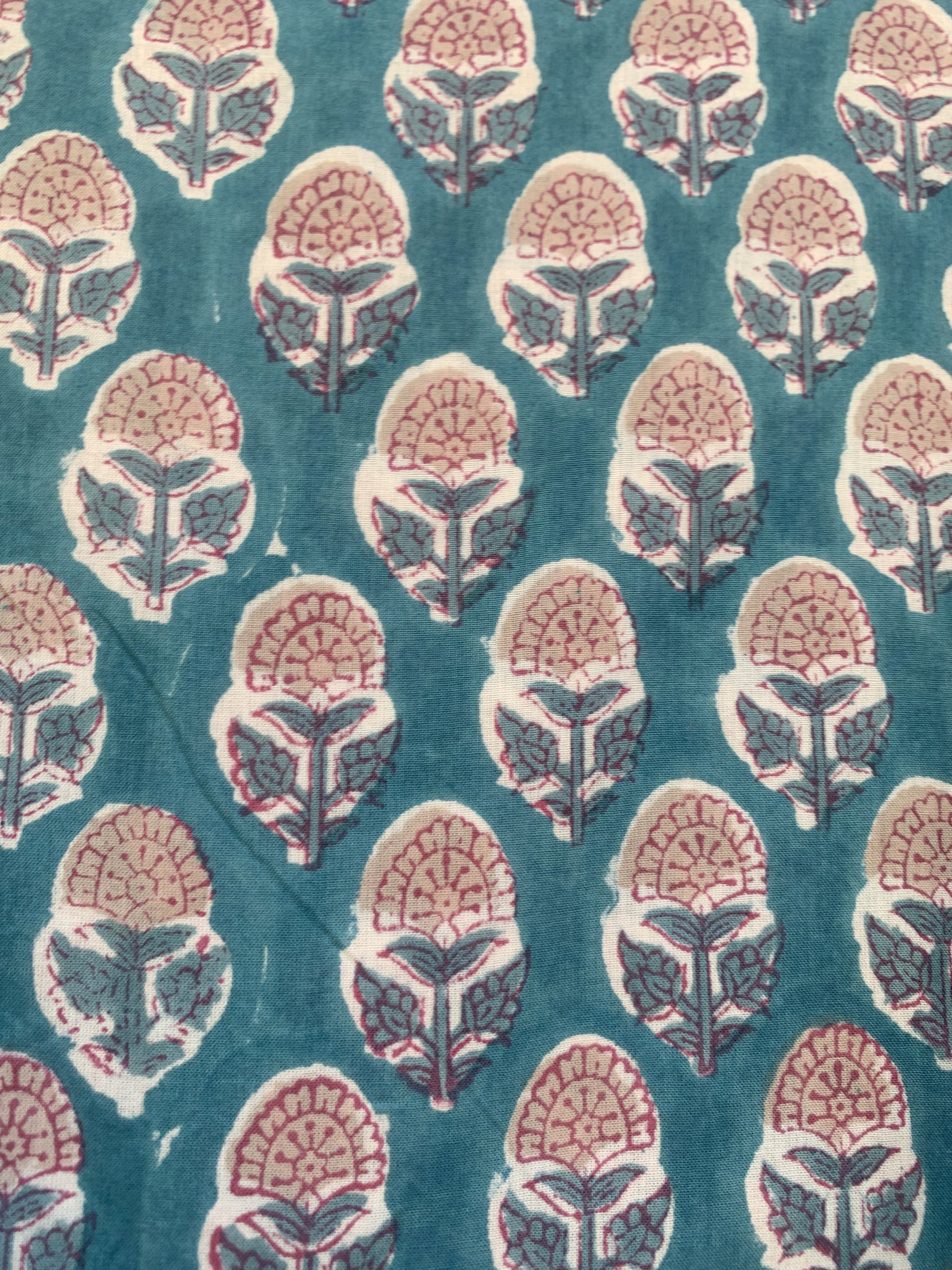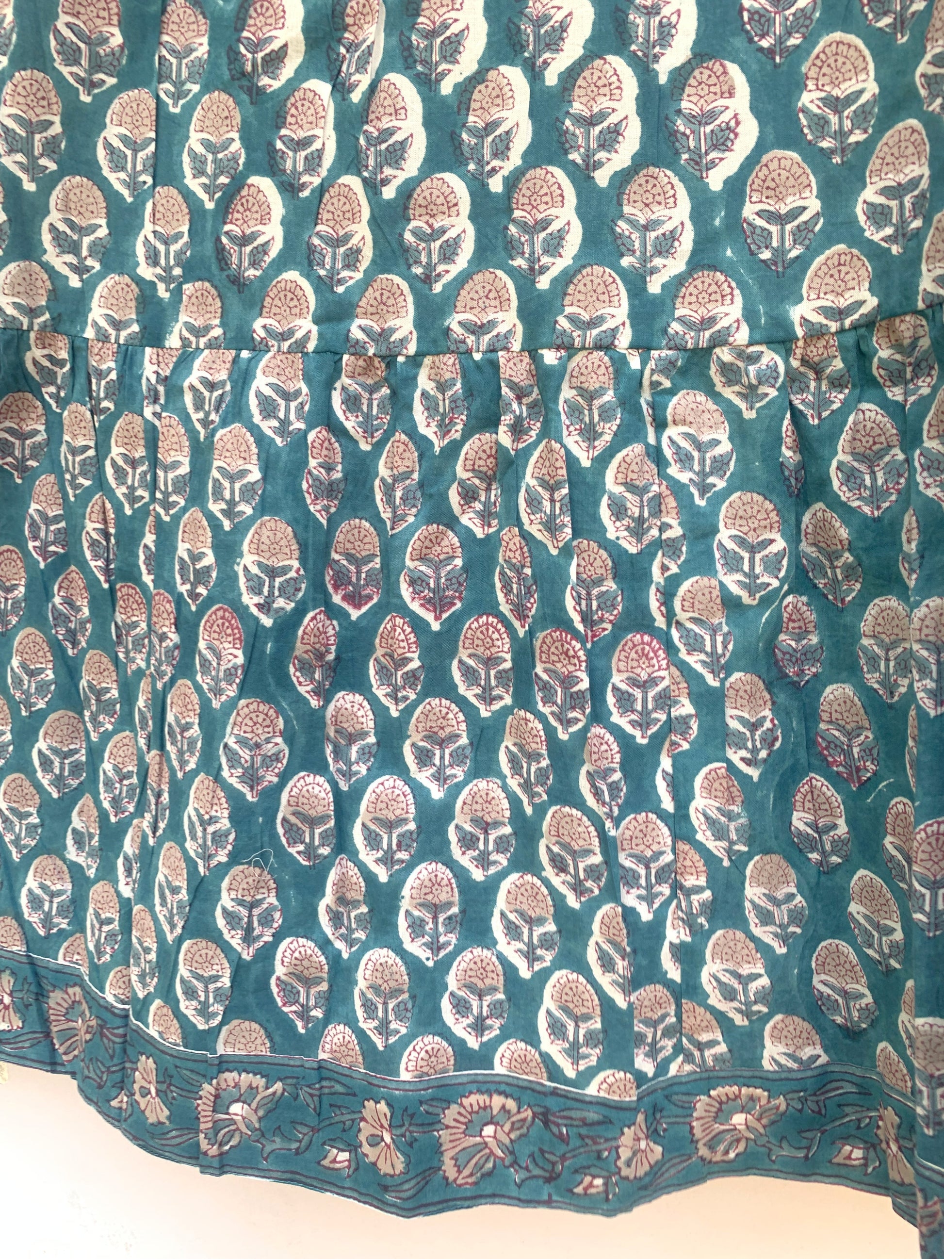 Teal Pink Floral Block Print Cotton Midi Dress – Boho Handmade Tiered Dress with Puff Sleeves