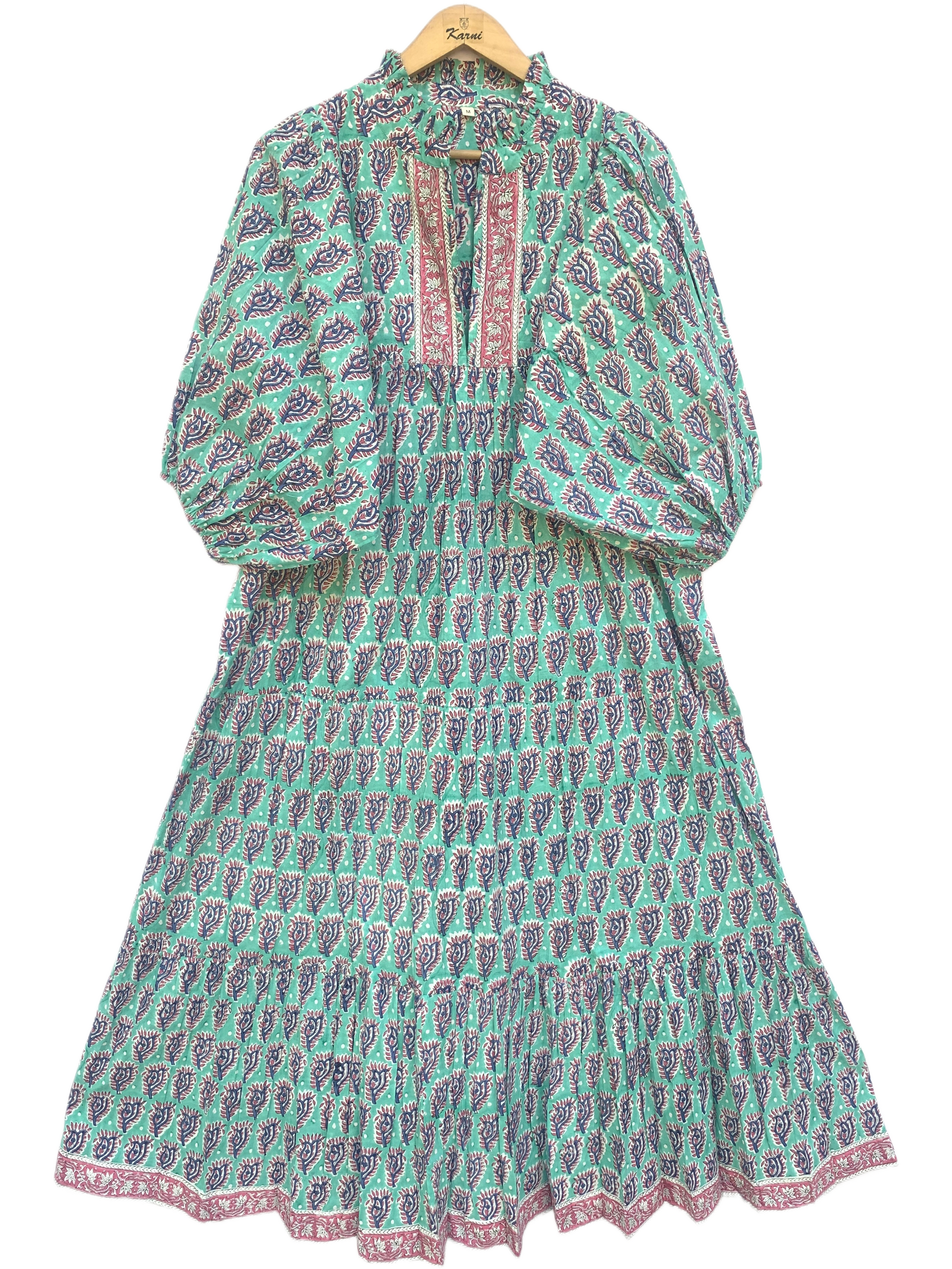 Teal Purple Floral Block Print Cotton Midi Dress – Boho Handmade Tiered Dress with Puff Sleeves & Contrast Yoke