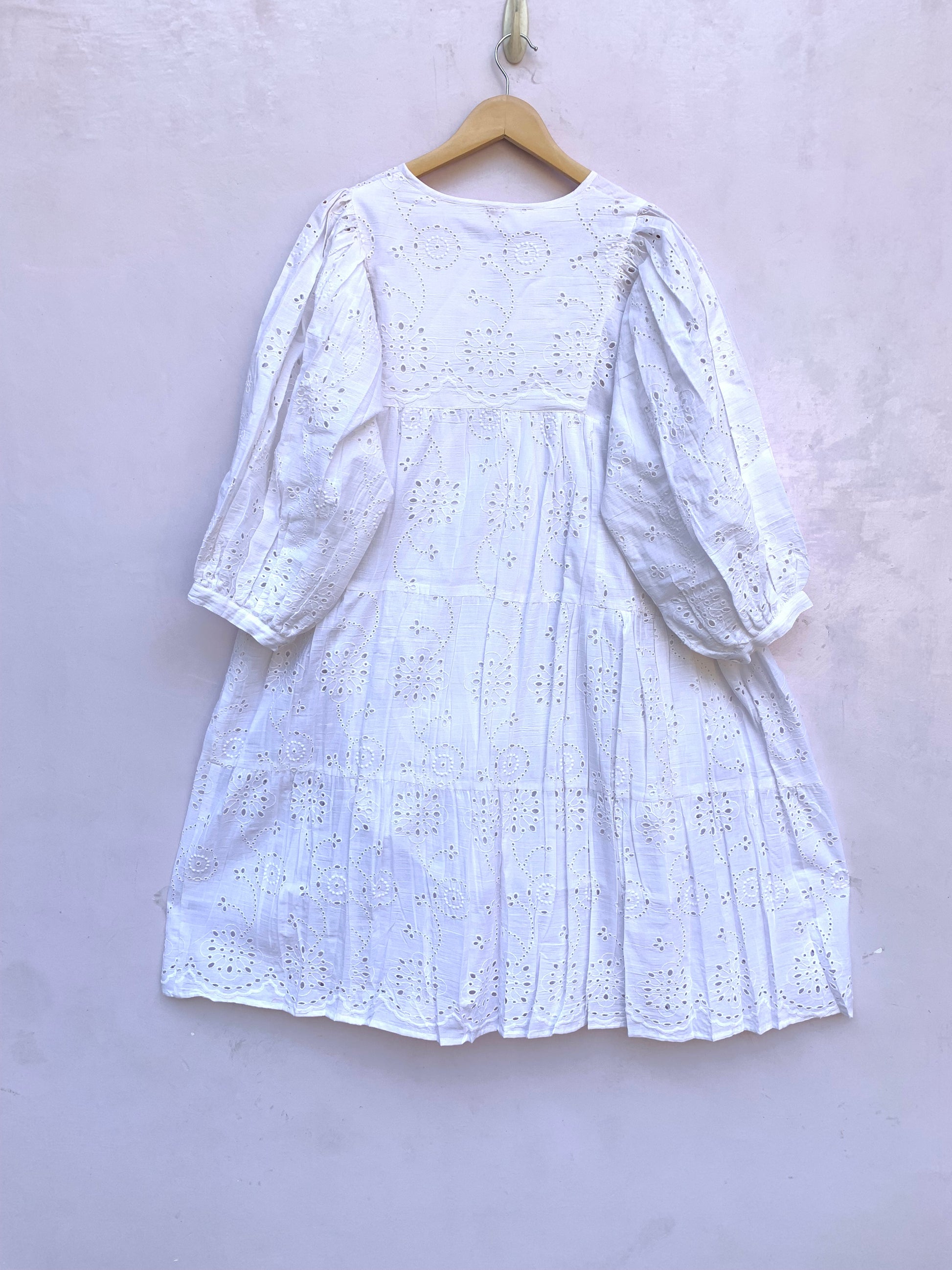 White Cotton Eyelet Mini Dress – Boho Tiered Long Sleeve Summer Dress