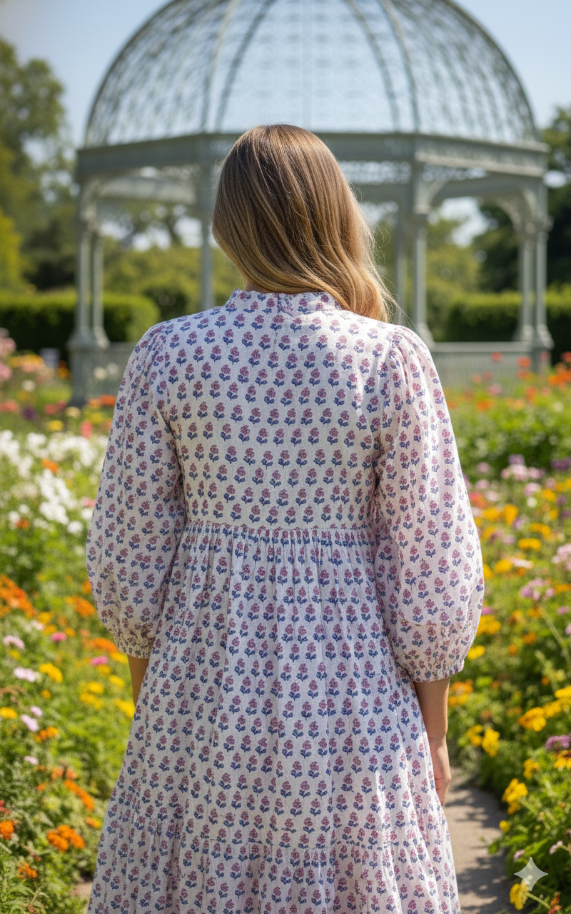 Each dress is hand block printed by skilled artisans in India, reflecting the beauty of traditional craftsmanship and the natural charm of slow fashion.