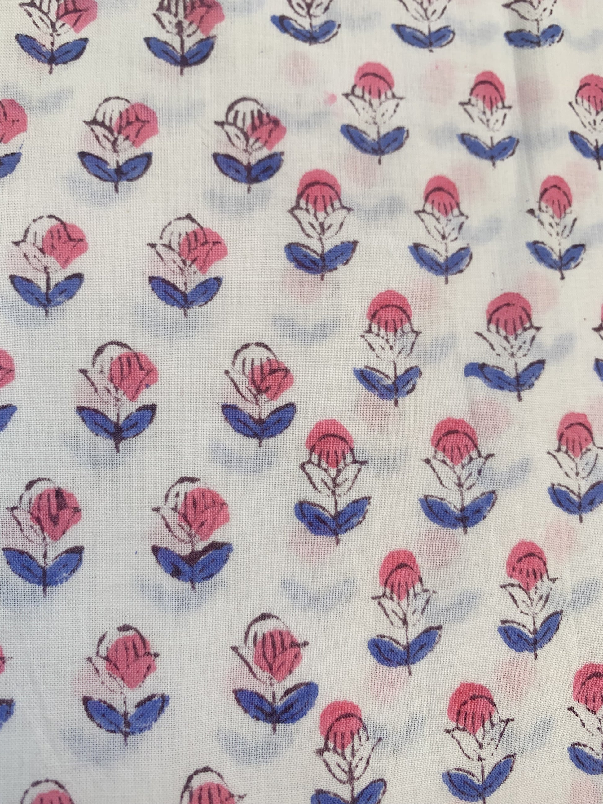Print: Hand block printed red and blue floral motifs on white base