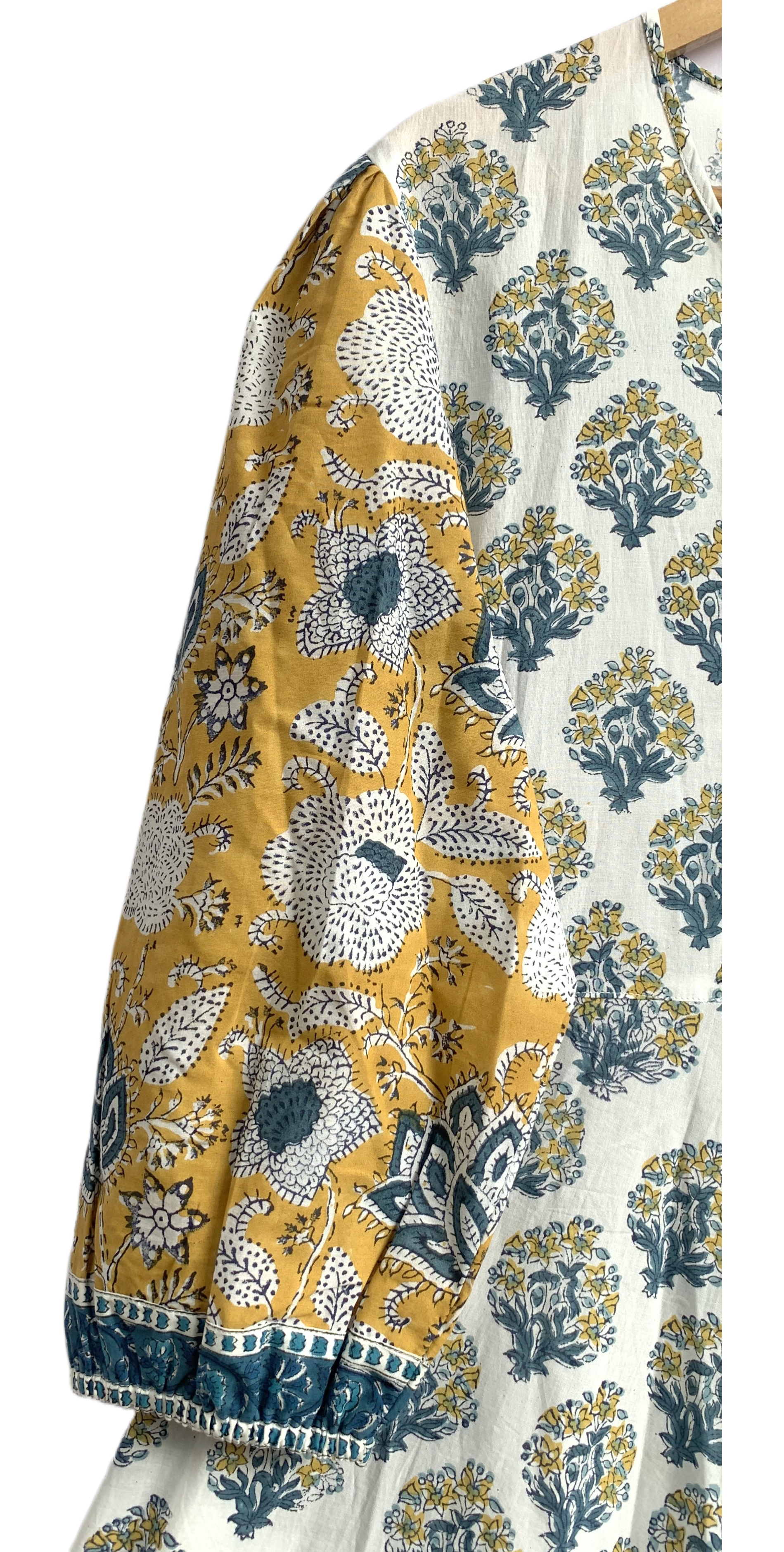 Bright, fresh, and effortlessly elegant—our yellow and ivory floral hand block print cotton maxi dress is a perfect blend of traditional craftsmanship and modern boho charm. The soft ivory base highlighted with warm yellow floral motifs creates a cheerful, sun-ready look ideal for summer days.